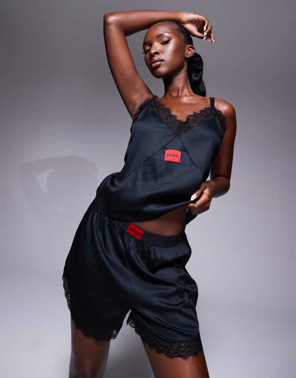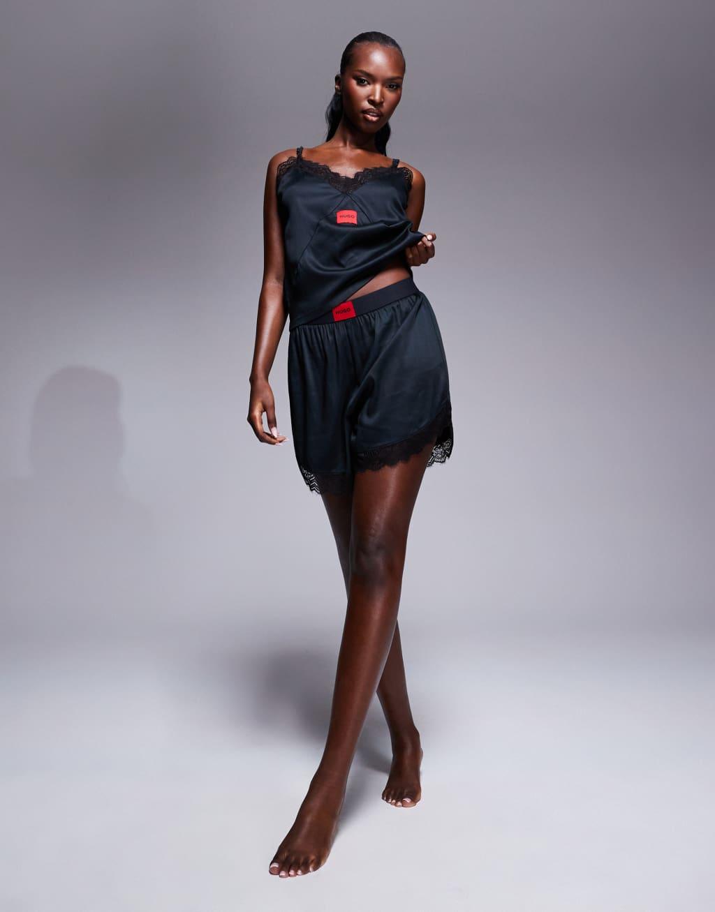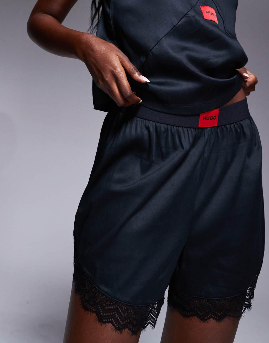 HUGO Bodywear satin lace trim pajama short in black - part of a set
