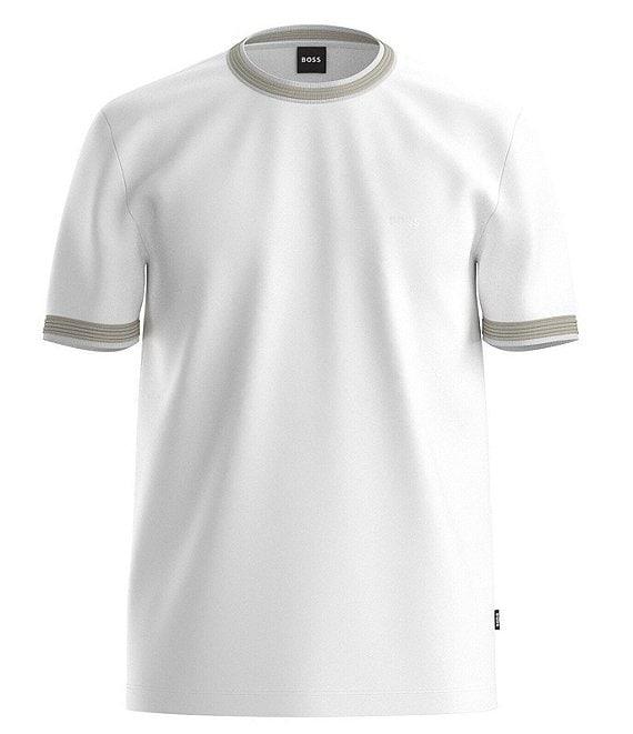 From Hugo Boss Big & Tall, this t-shirt features: Ribbed crew neckline with contrasting detail Short sleeves with contrasting cuffs Printed "BOSS" logo on the left side of chest Slim fit Pullover construction Cotton Machine wash/tumble dry Imported.