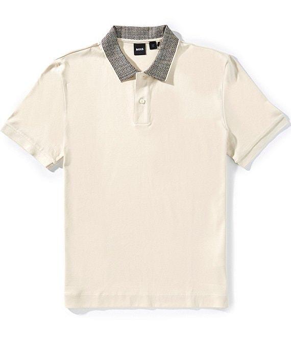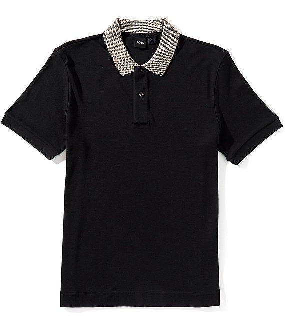 From Hugo Boss, this polo shirt features: Solid tone Contrasting polo collar with an all-over pattern Short sleeves 2-button placket Pullover construction Regular fit Pima cotton Machine wash/tumble dry Imported.