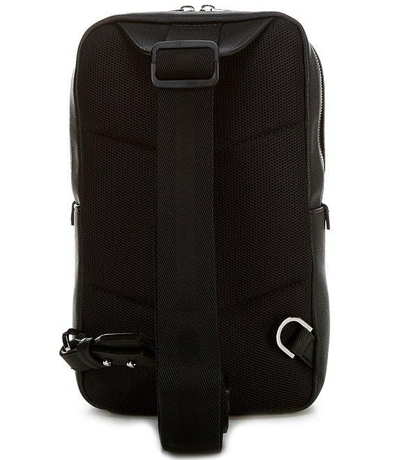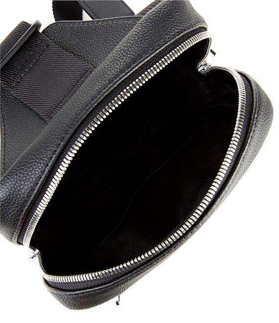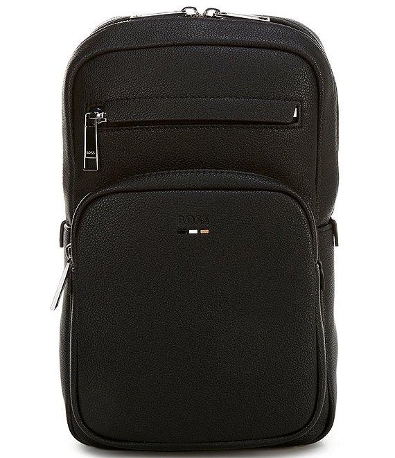 From Hugo Boss, this bag features: Boss logo embossed with tri-color metal plates Two zippered pockets on the front Adjustable shoulder straps Zippered closure Recycled polyurethane/polyester Lining of polyester Facing of recycled polyamide One size; 7.1" x 3.3" x 11.8" Imported.