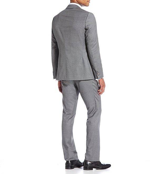 From Hugo Boss, this 2-piece suit features: Jacket: Notch lapel Long sleeves Side vent Houndstooth Flap pockets Fully lined 2 button closure Slim fit Pants: Flat front Houndstooth Front button/zip closure Care: Wool/elastane Dry clean Imported.