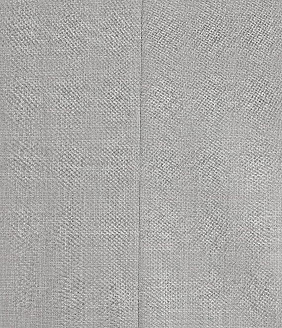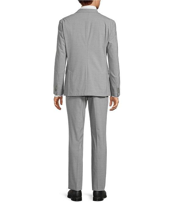 From Hugo Boss, this 2-piece suit features: Jacket: Solid Notch lapel Long sleeves Button cuffs 2-button closure Flap pockets Side vent Unlined Pants: Solid Flat front Front button/zip closure Full length Straight legs Care: Polyester/wool/elastane Machine wash/hang dry Imported.