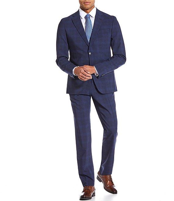 From Hugo Boss, this 2-piece suit features: Jacket: Plaid Notch lapel Long sleeves Side vent Flap pockets Unlined 2 button closure Wool/elastane Machine wash Pants: Plaid Flat front Front button/zip closure Wool/elastane Machine wash Imported.