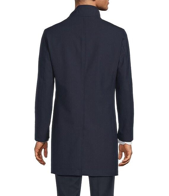 From Hugo Boss, this coat features: Slim fit Stand collar Long sleeves Button-front closure Side slash pockets Zip chest pockets Fully lined, back vent Polyester/wool/viscose/elastane Dry clean Imported.