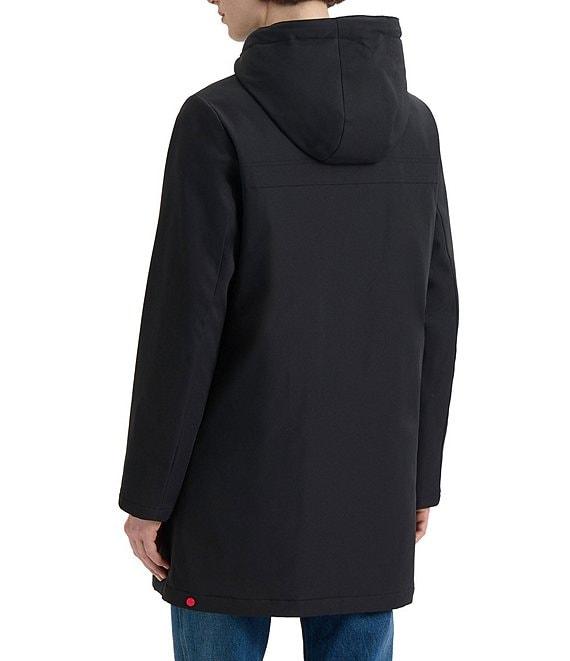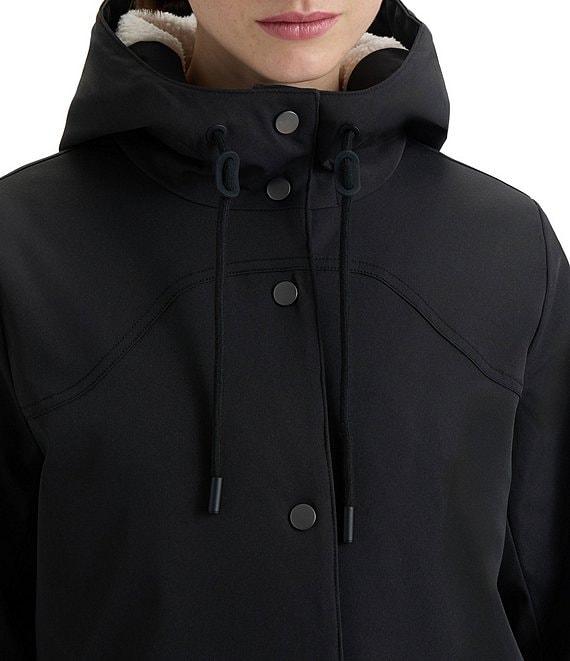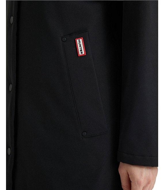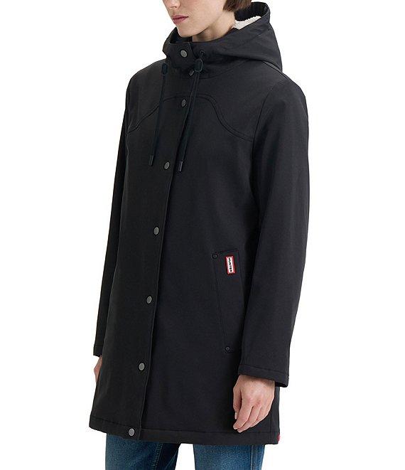 From Hunter, this jacket features: Canvas fabrication Rain coat silhouette Stand collar neckline Permanent hooded with berber lining Long sleeves Front welt pockets Logo patch at pocket Water repellent Slit Straight fit Straight hemline Metal snap front closure Approx. 32" length Polyester Machine wash Imported.