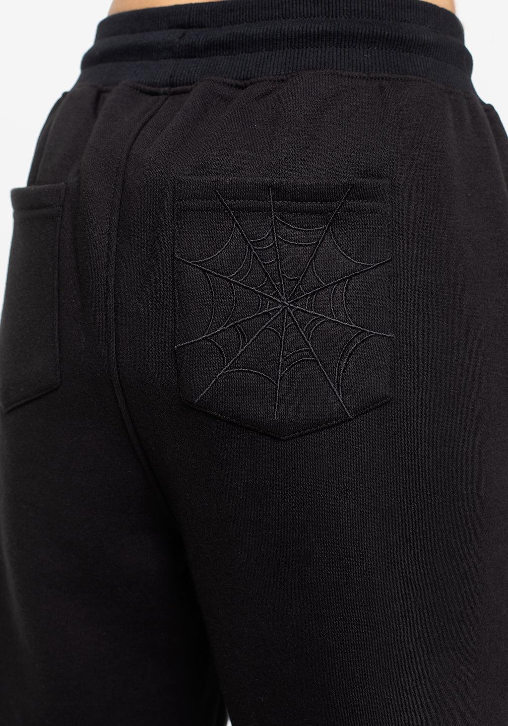 Don’t let the Huntsman bite - Black spider embroidered tapered joggers - Comfy relaxed fit with tapered legs - Wide elasticated drawstring waistband - Two side & two back pockets holds essentials - Cuffed ankles keep you warm - Buttery soft cotton-blend jersey fabric - Toweled spiders on legs plus web embroidery on back pocket - Loungewear with an edge 63% cotton, 37% polyesterFifi is 5'6" and wearing a UK6/ US2