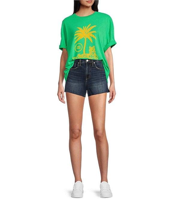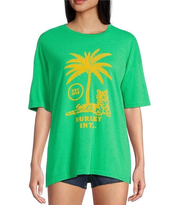 From Hurley, this t-shirt features:Ribbed necklineShort sleevesPalm tree and tiger graphic plus "Hurley" logo and other verbiage screen printed on the frontPullover stylingCotton loose-knit jerseyMachine wash/tumble dryImported.
