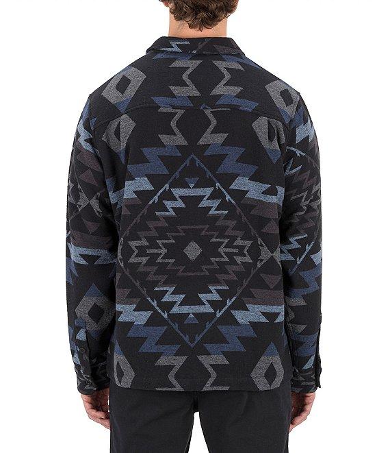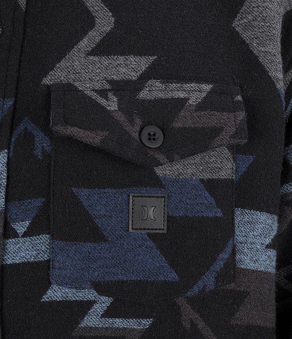 From Hurley, this shacket features: Allover jacquard print Point collar Long sleeves Left chest patch pocket with button flap closure Pleats at back yoke Straight hem Icon faux leather patch Recycled polyester resin button closure Cotton with poplin interior lining Machine wash/tumble dry low Imported.