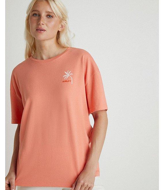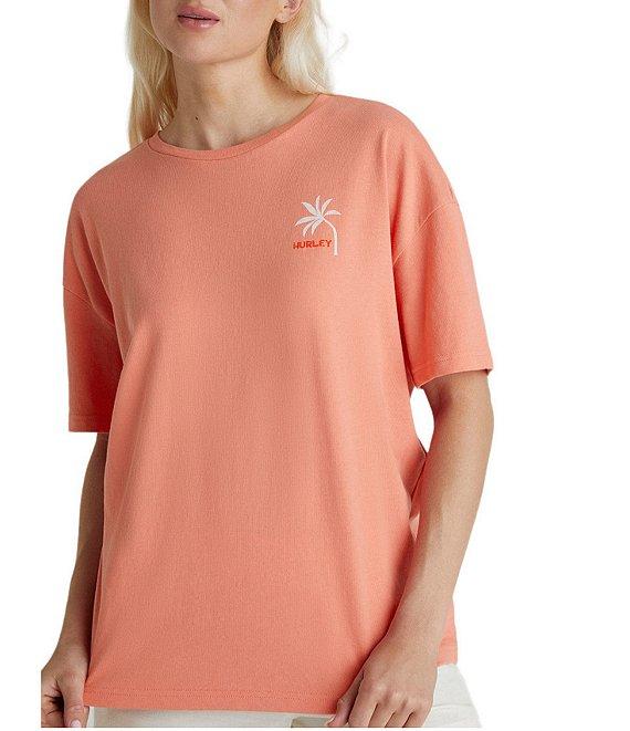 From Hurley, this t-shirt features: Ribbed crew neckline Short sleeves "Hurley" logo and palm tree screen print on the front and back Pullover styling 26 1/2" high point shoulder length Cotton loose-knit jersey Machine wash/tumble dry Imported.