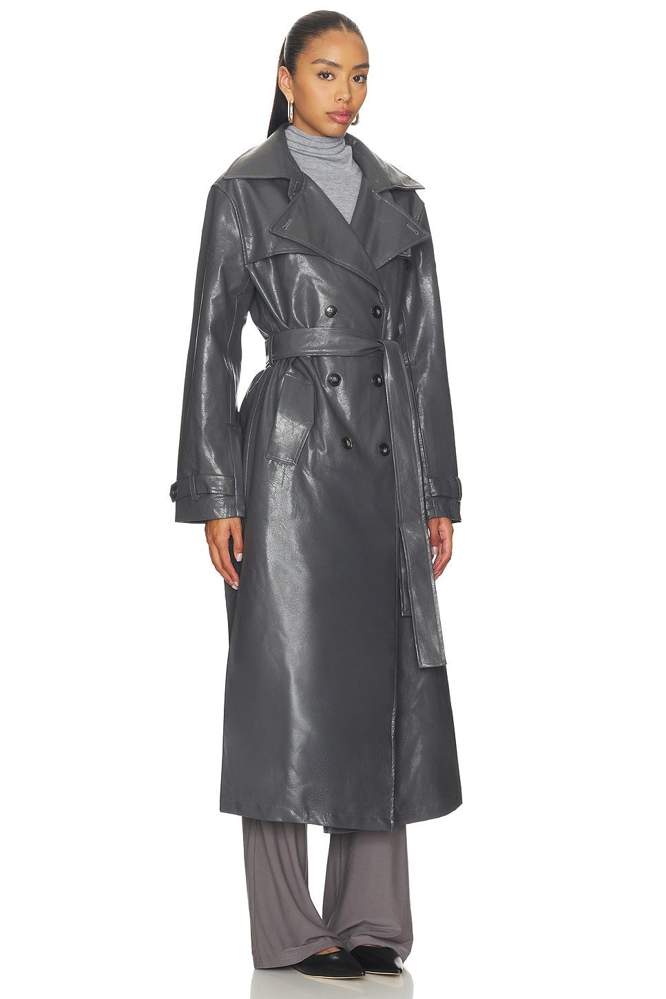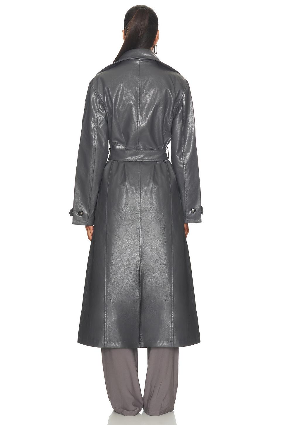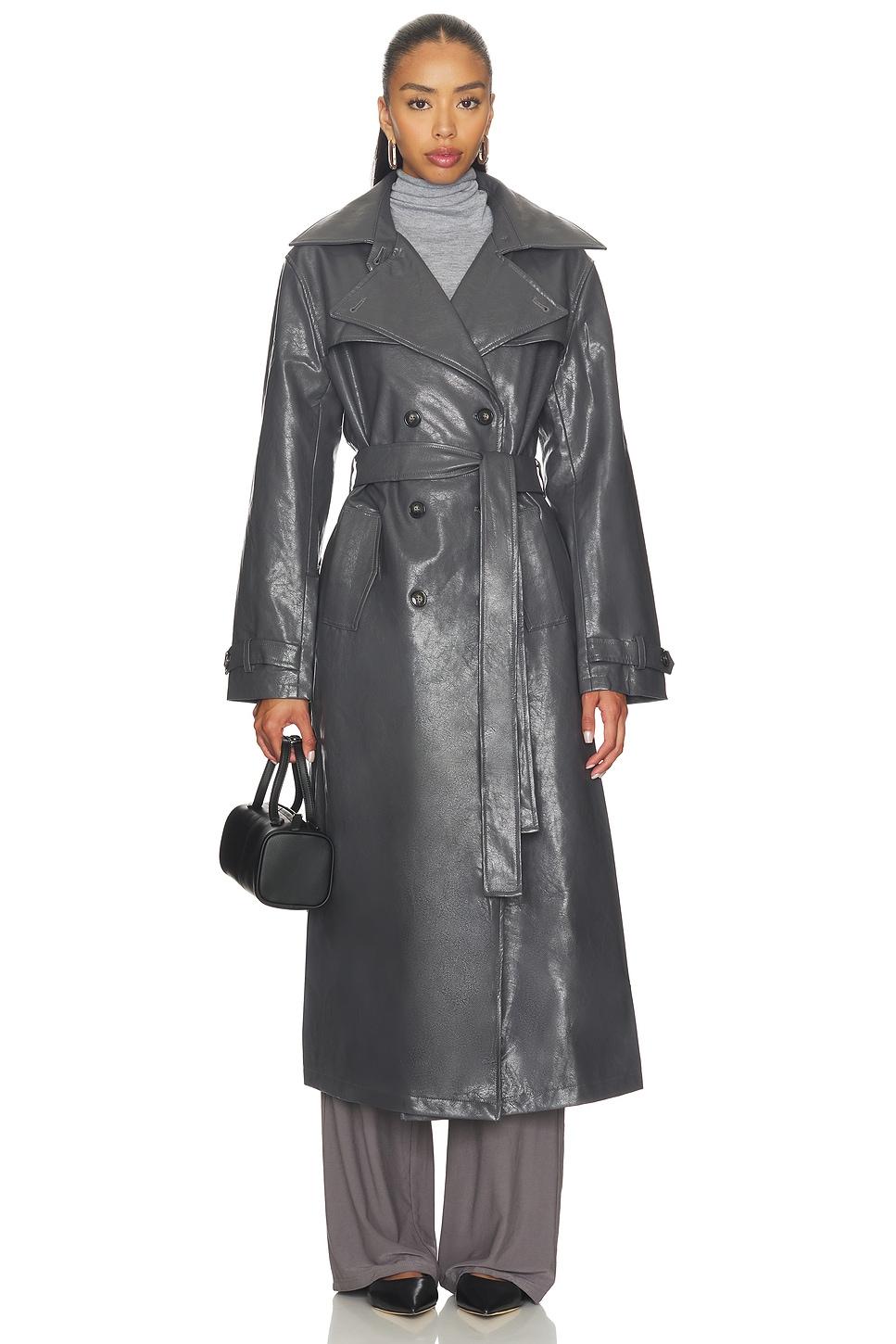 Self: 45% polyurethane, 55% rayonLining: 100% polyester. Made in China. Spot clean. Button closure at front and sleeve cuffs. Side slant pockets. Faux leather fabric. Removable and adjustable belt. Revolve Style No. MTHR-WO8. Manufacturer Style No. MS3497.