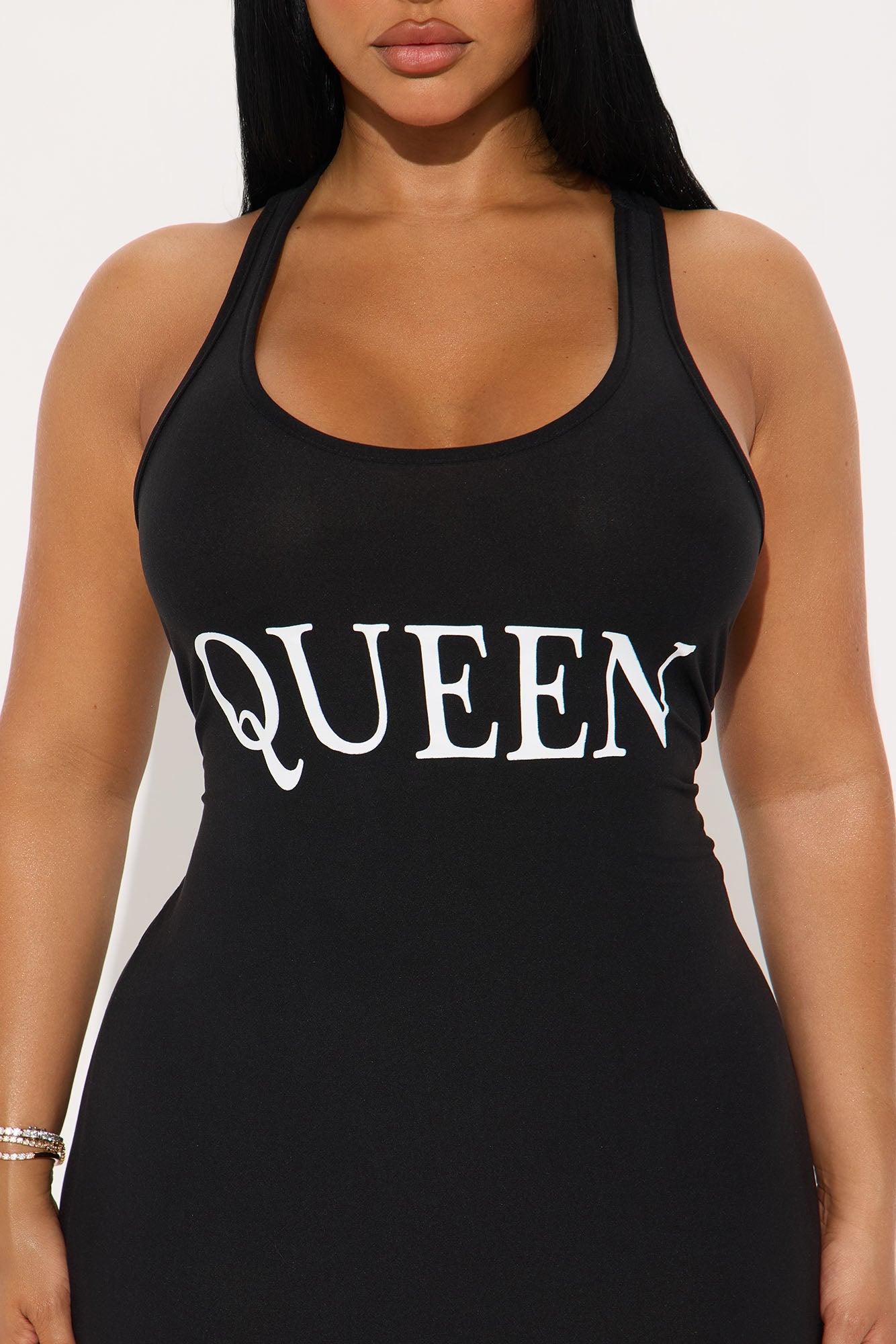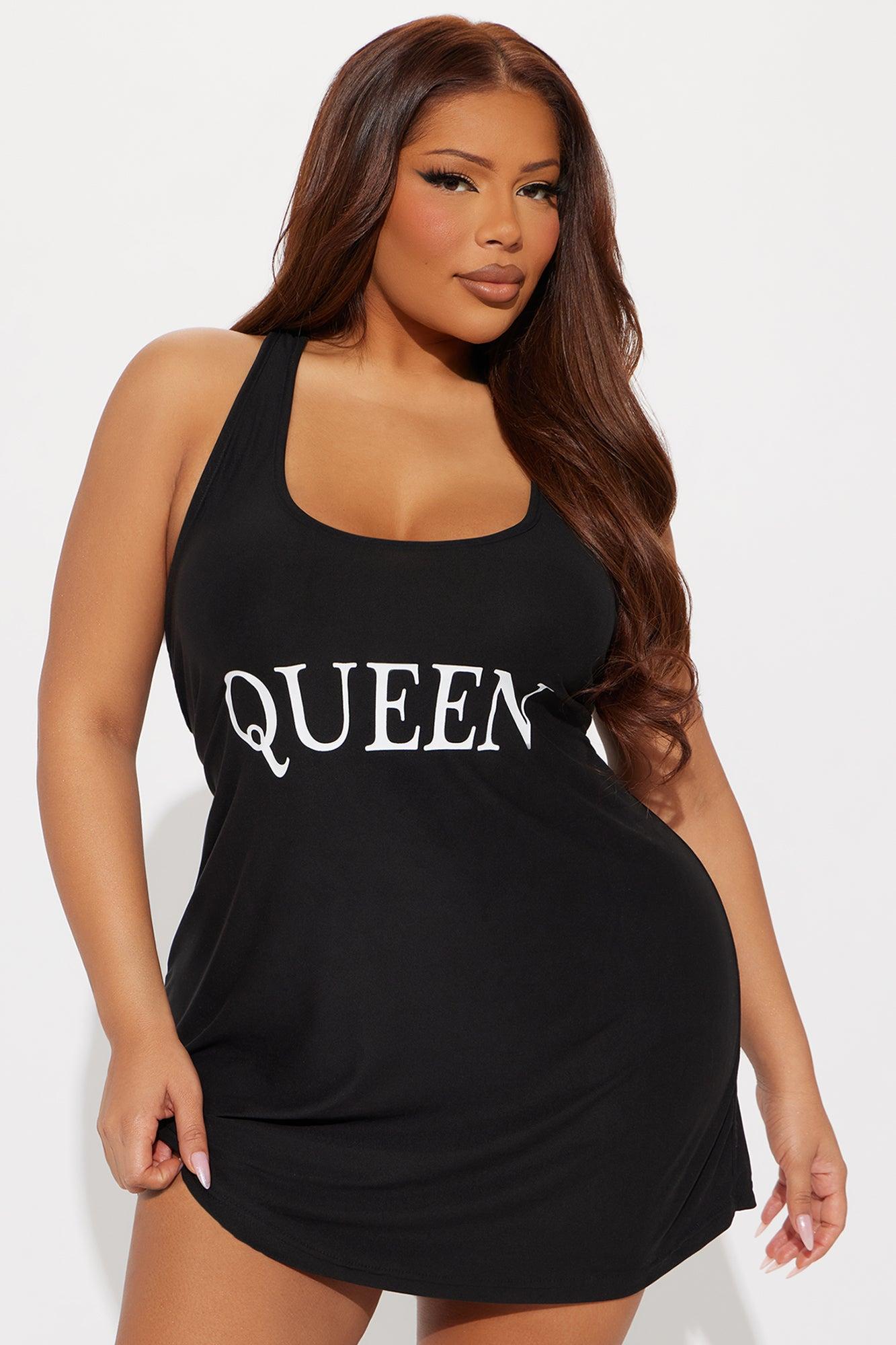 Available In Black. PJ Sleep Dress Racerback Queen Verbiage Stretch Final Sale Disclaimer Print Placement May Vary 95% Polyester 5% Spandex Imported