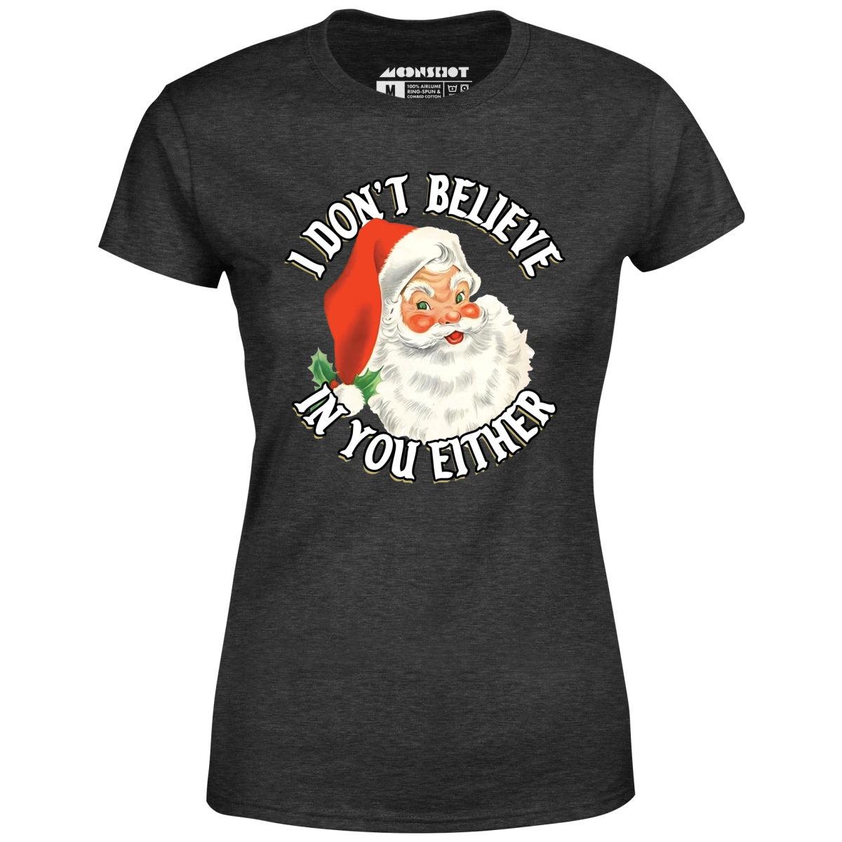 Fine then, he doesn't believe in you either. A funny festive Santa Claus inspired T-Shirt for the holiday season. Printed on our super soft 100% ringspun & combed cotton women's T-Shirt. Or upgrade to our Luxury 52/48 cotton/poly vintage heather edition for an even softer classic look. We print & ship all of our high quality graphic tees in the USA.