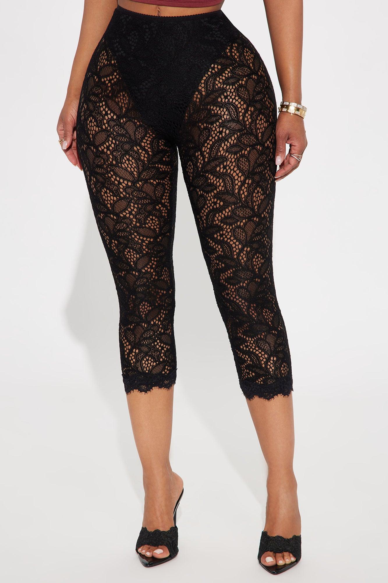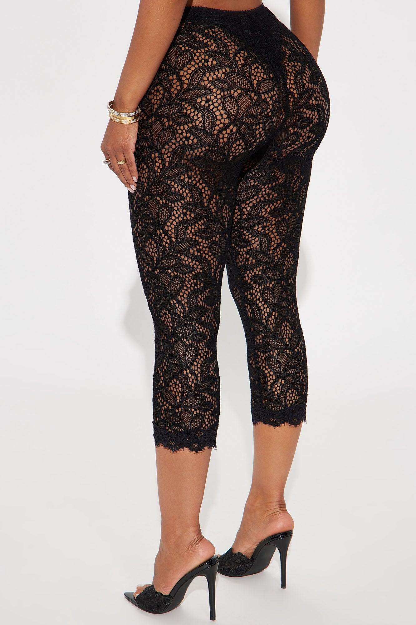 Available In Black. Lace Legging Mid Rise Elastic Waistband Panty Lining Stretch 21" Inseam Disclaimer: Lace Design Placement Will Vary Self: 90% Nylon 10% Spandex Lining: 95% Polyester 5% Spandex Final Sale Imported