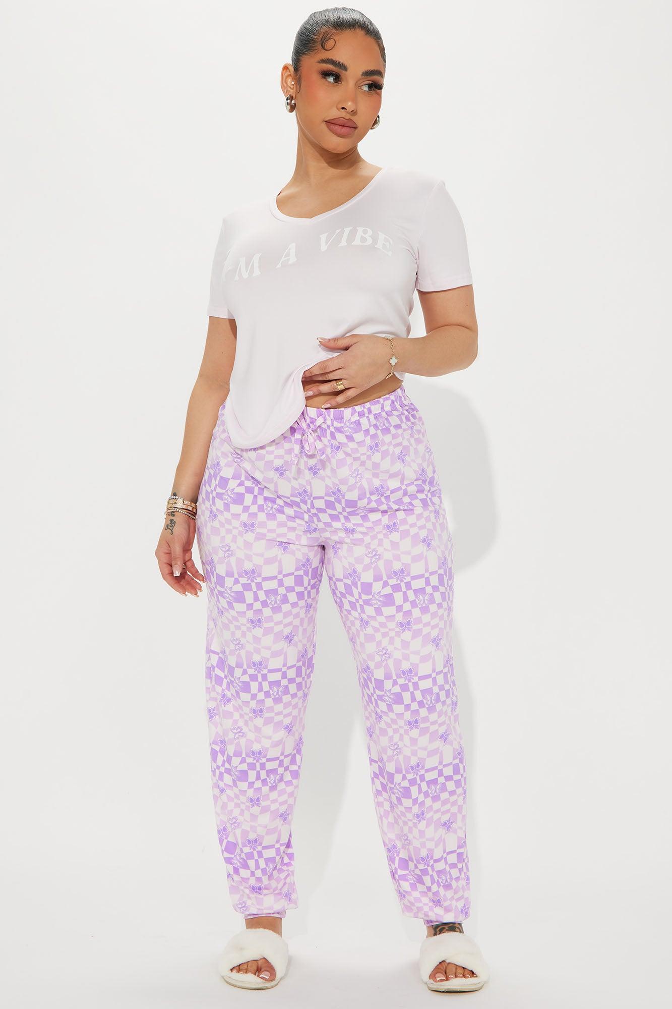 Available In Lavender. 2 Piece Ensemble PJ Short Sleeve TShirt I'm A Vibe Verbiage Matching Jogger Pants Drawstring Waistband Checkered Butterfly Print Stretch Final Sale Disclaimer: Due To The Printing Process A Difference In Saturation May Occur. Each Garment Is Unique. Print Placement Will Vary. 95% Polyester 5% Spandex Imported