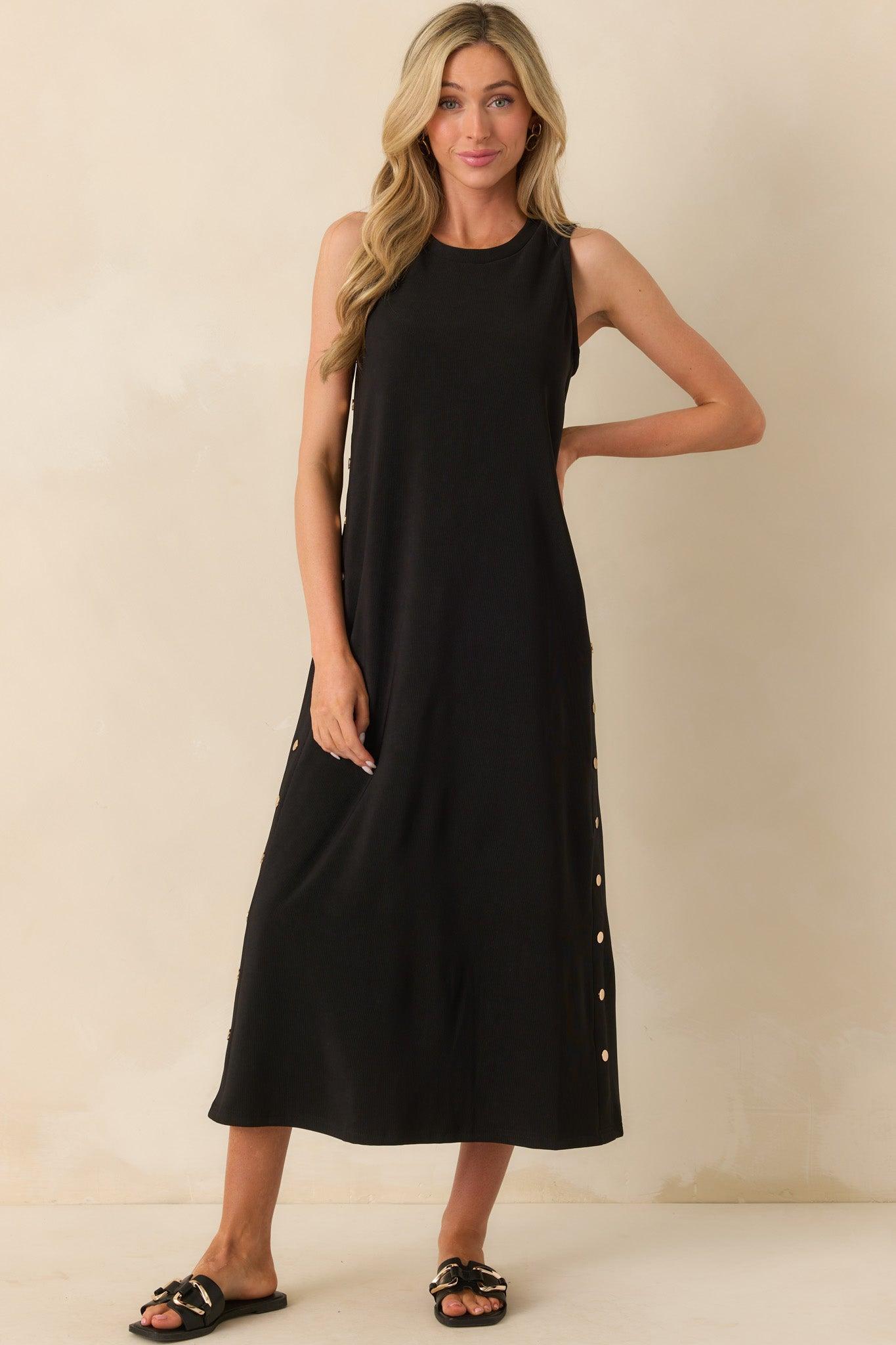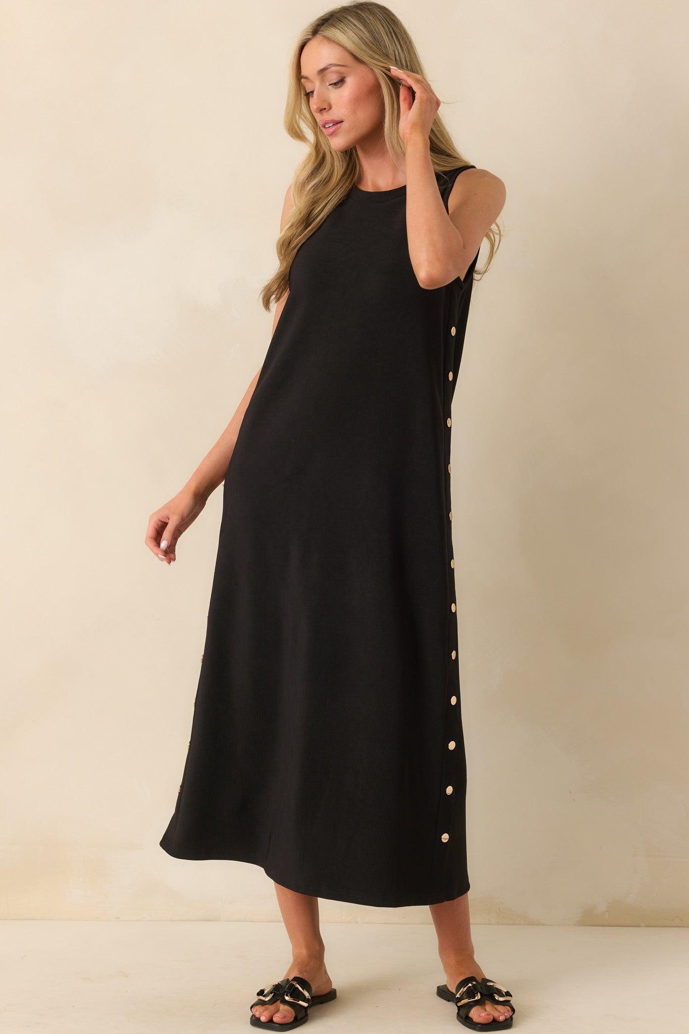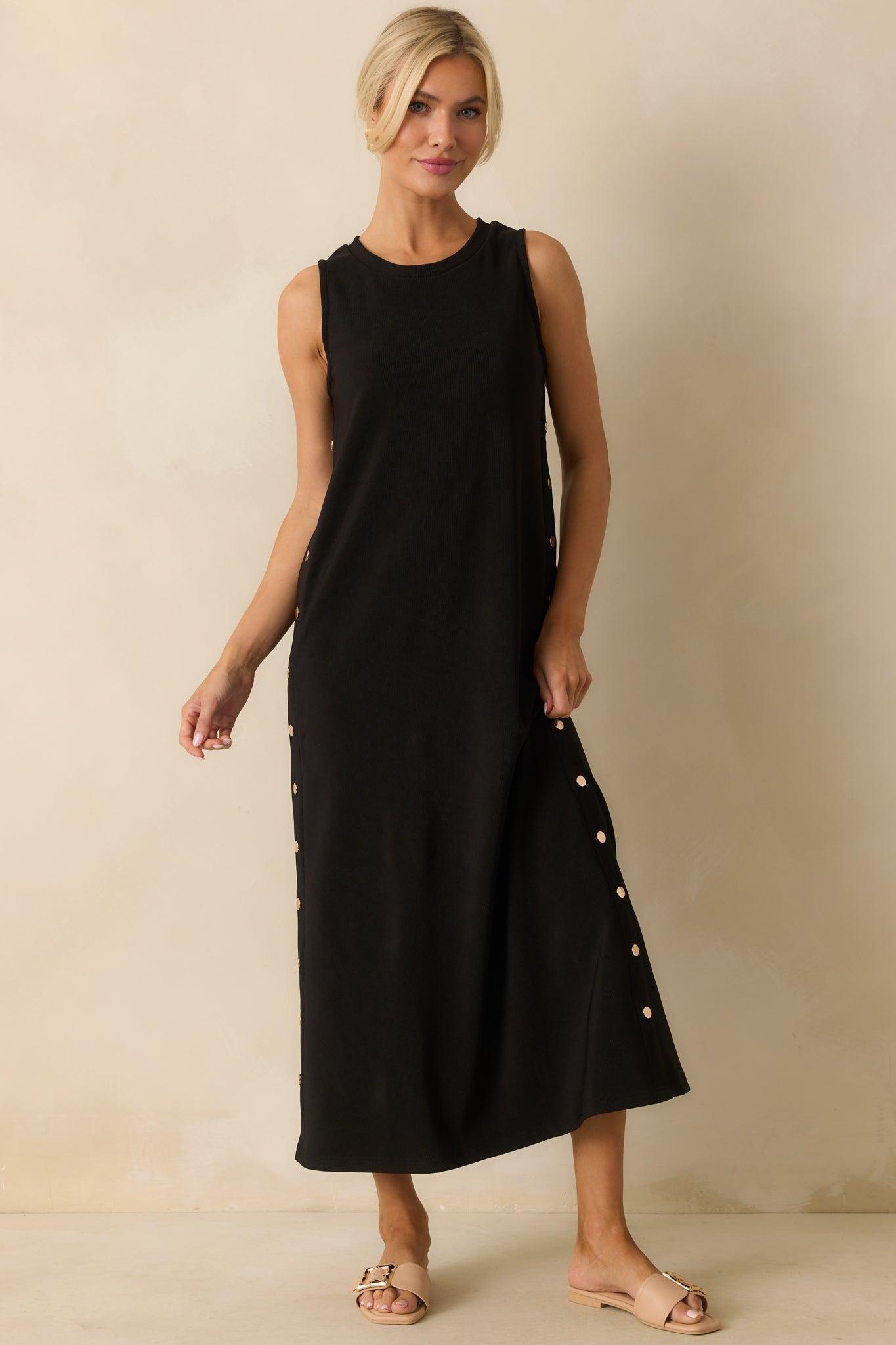 The I'm Choosing Happiness Black Sleeveless Maxi Dress is a reminder that joy can be a choice. Whether it's a special day or just an ordinary one, this is the kind of piece that feels like a little celebration every time you put it on. This black maxi dress features a crew neckline, sleeveless design, decorative gold button sides, back center seam, back vent slit, and a relaxed fit.
