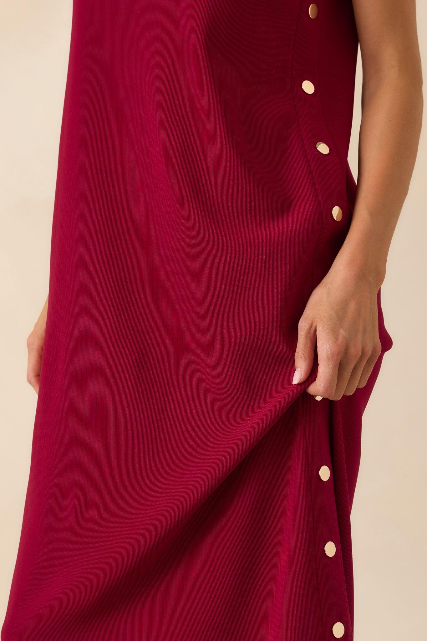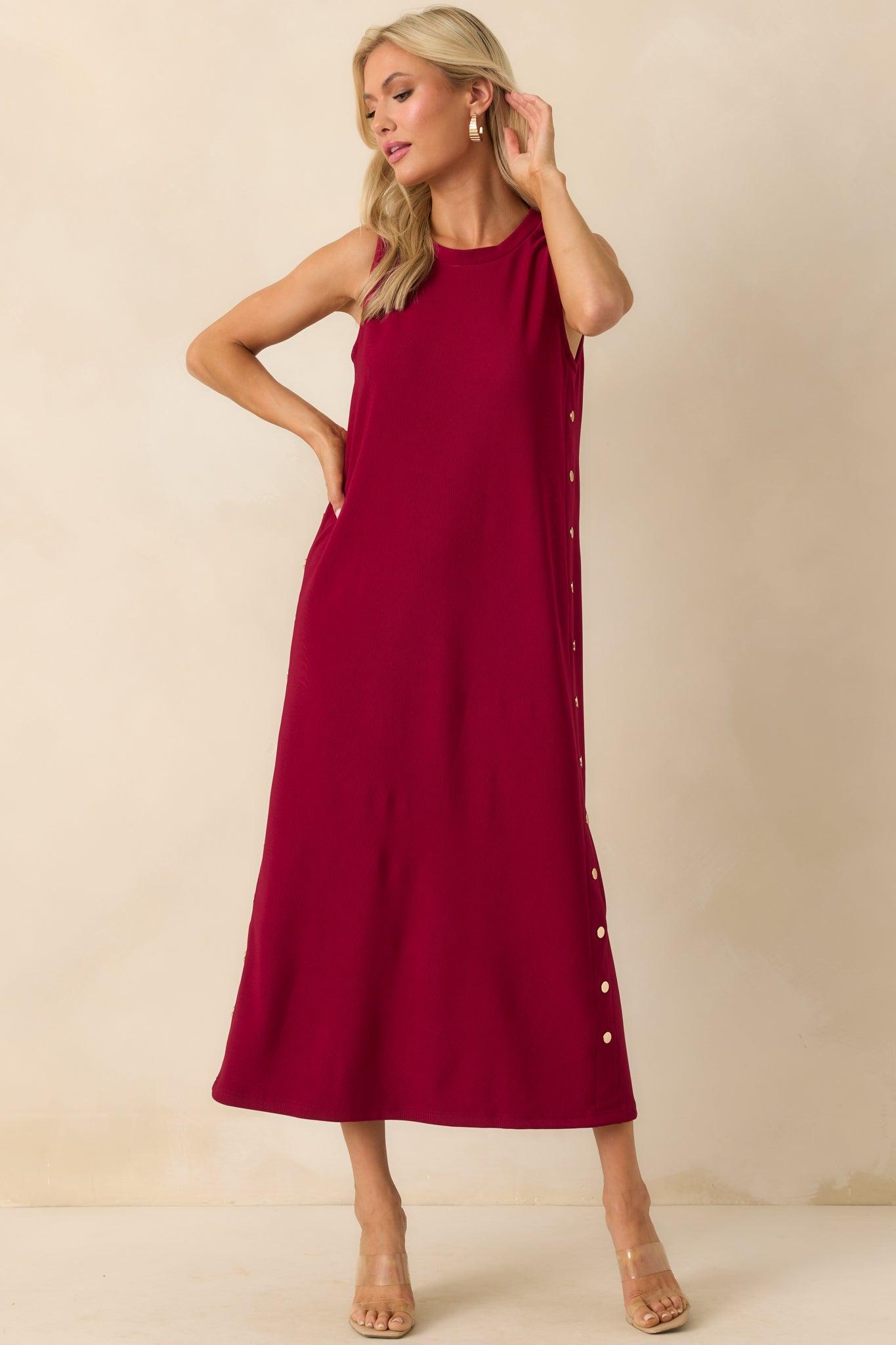 The I'm Choosing Happiness Burgundy Sleeveless Maxi Dress is a reminder that joy can be a choice. Whether it's a special day or just an ordinary one, this is the kind of piece that feels like a little celebration every time you put it on. This burgundy maxi dress features a crew neckline, sleeveless design, decorative gold button sides, back center seam, back vent slit, and a relaxed fit.
