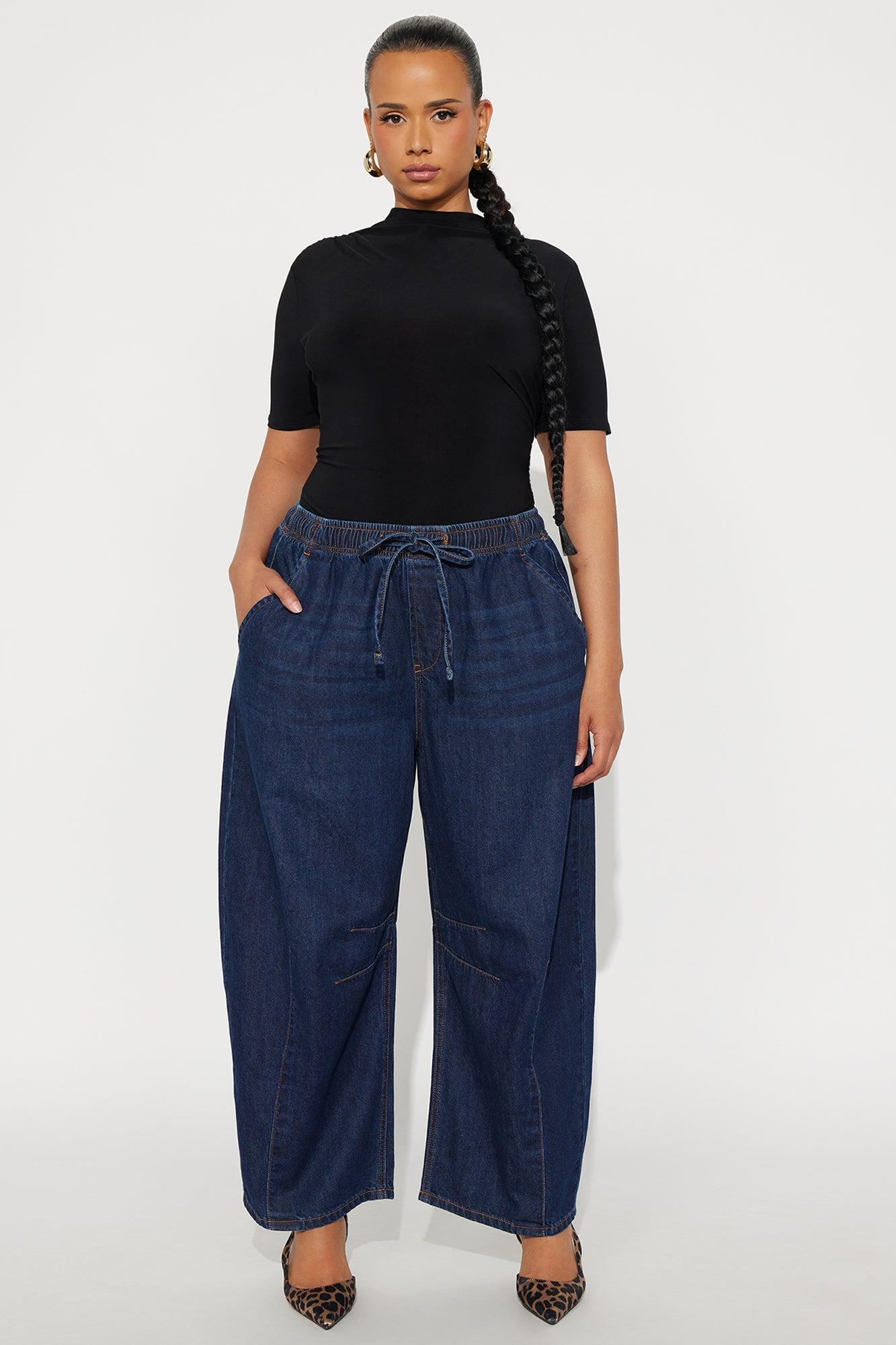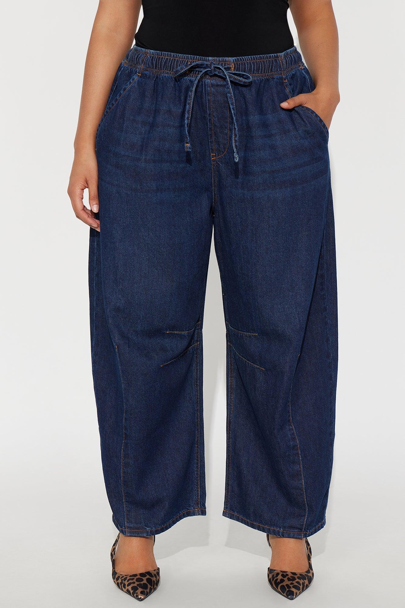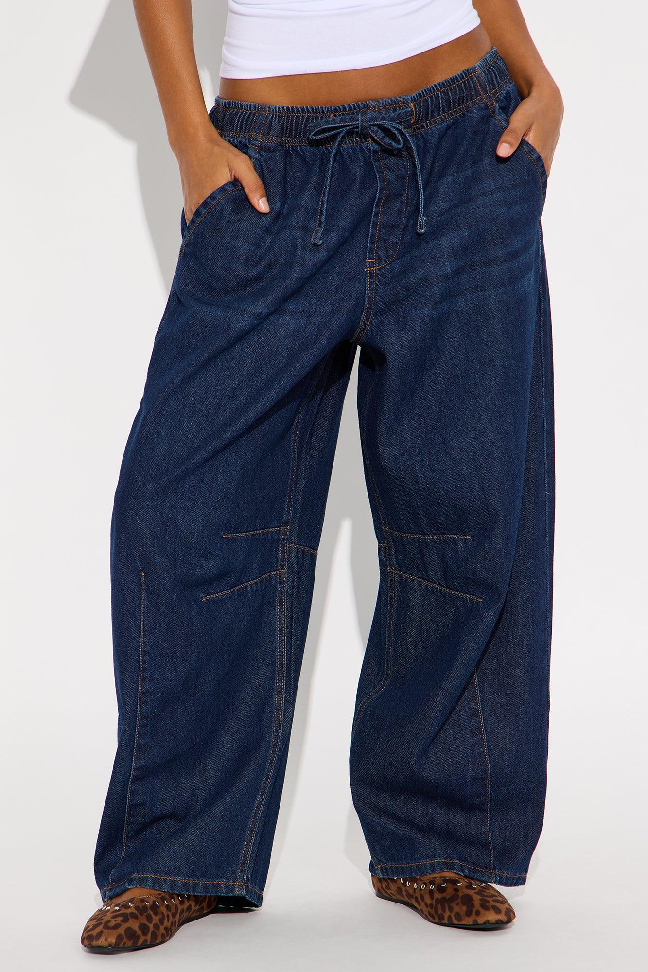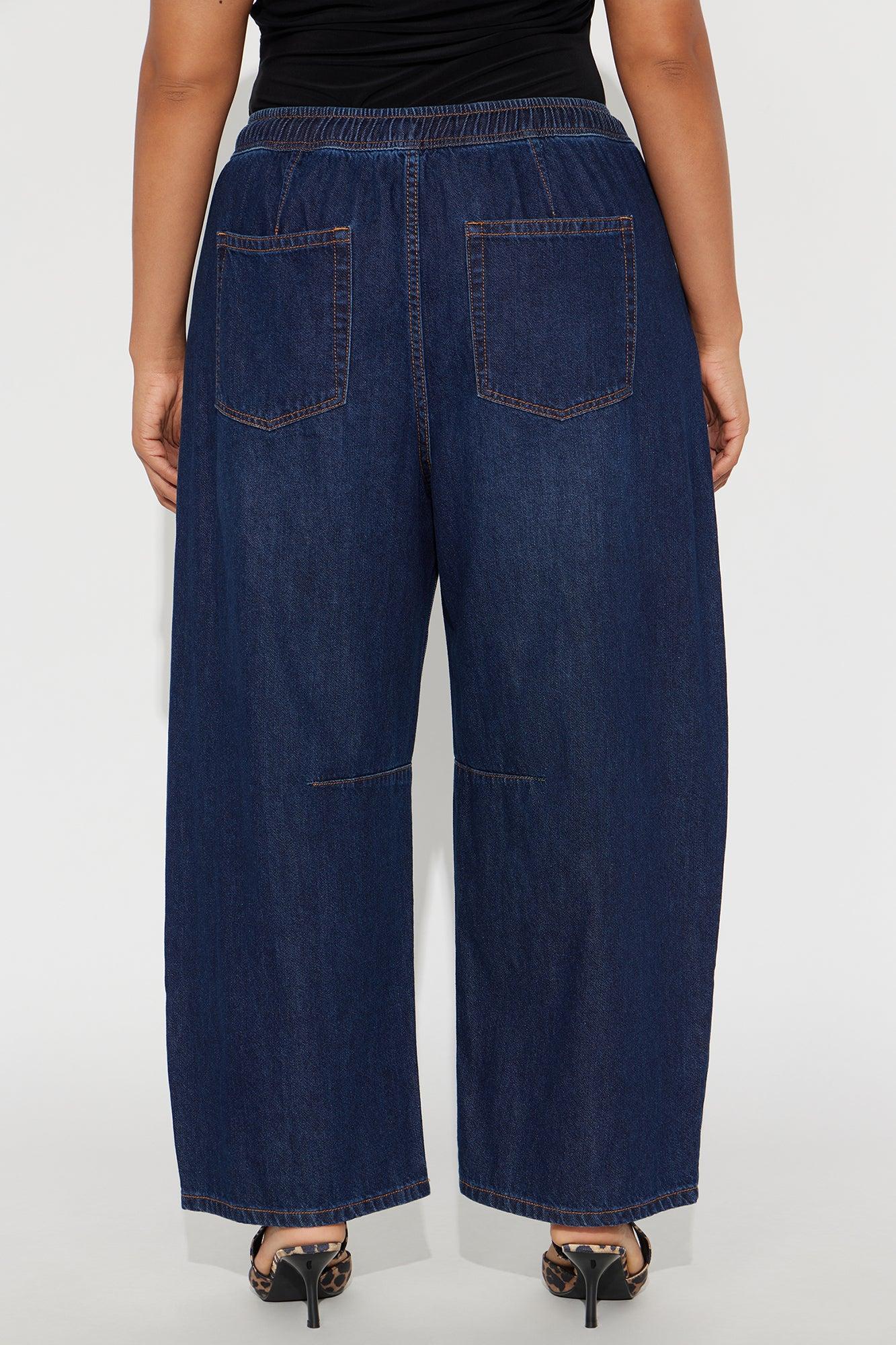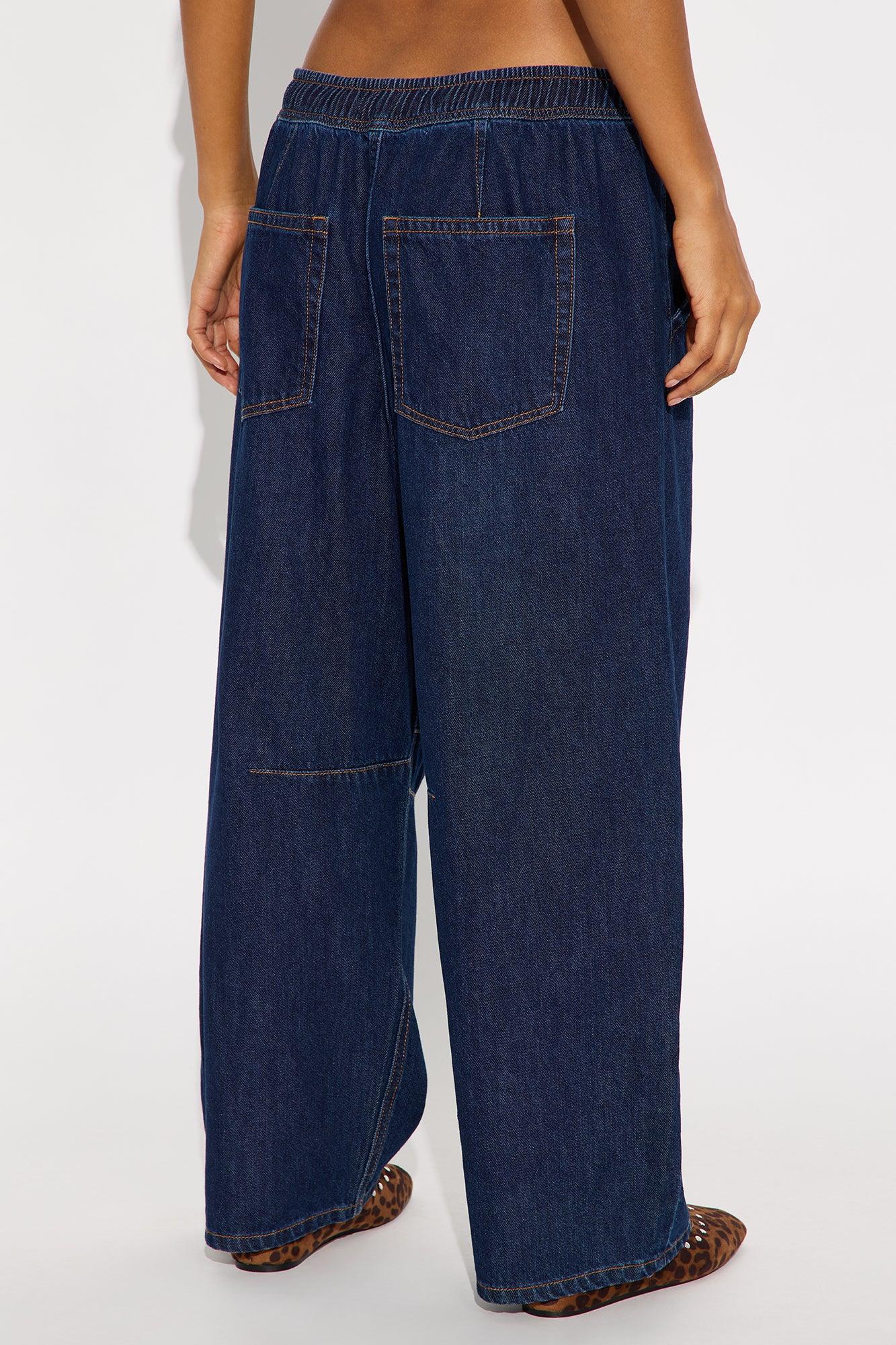 Available In Dark Wash. Wide Leg Jean 4 Pocket Pull On Elastic Waistband With Drawcord Dart Details 12" Rise 26" Inseam Non Stretch Disclaimer Due To The Specialized Wash Process, Each Garment Is Unique. 100% Cotton Imported California Proposition 65WARNING: Cancer and Reproductive Harm - www.P65Warnings.ca.gov.