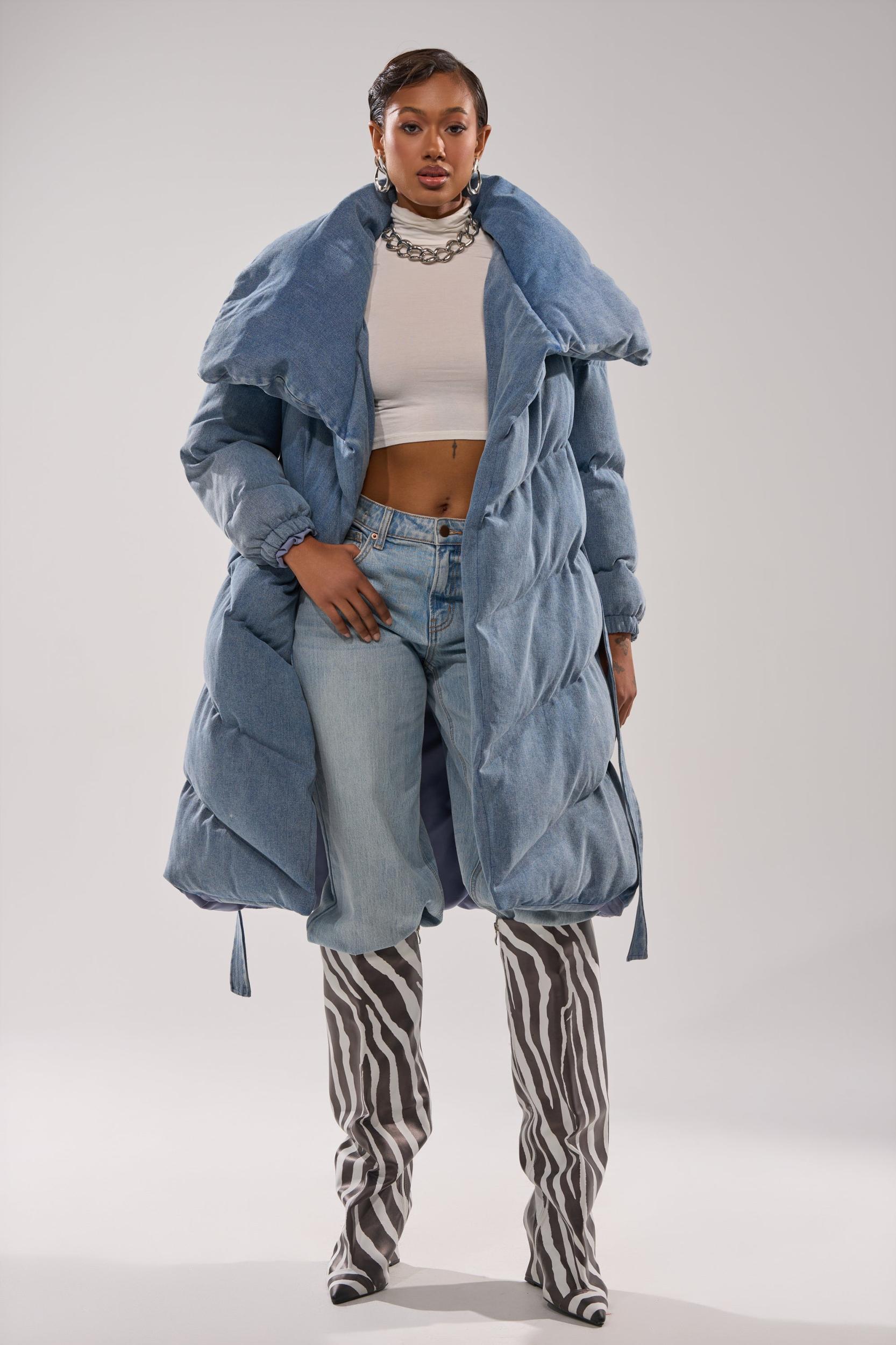 Bundle up in style in the AKIRA Label I’m Outside Denim Puffer! This denim puffer coat combines cozy winter warmth with elevated streetwear style, featuring a dramatic oversized shawl collar, quilted padding, front pockets, and a wrap-style silhouette secured with a matching denim belt for a flattering, cinched waist. Crafted from soft, medium-wash denim and lined with a soft satin like material with interior pockets, the coat offers a unique twist on classic outerwear while providing full-length coverage and voluminous insulation. - 100% Cotton- No Stretch- Imported (all measurements are approximate from size S/M)- 41.5” Shoulder to Hem- 19” Shoulder to Shoulder- 20” Sleeve- 80” Belt- Model is 5’9” and wearing size S/MProduct ID: 1069078