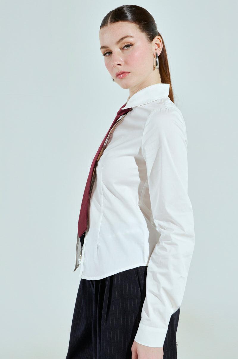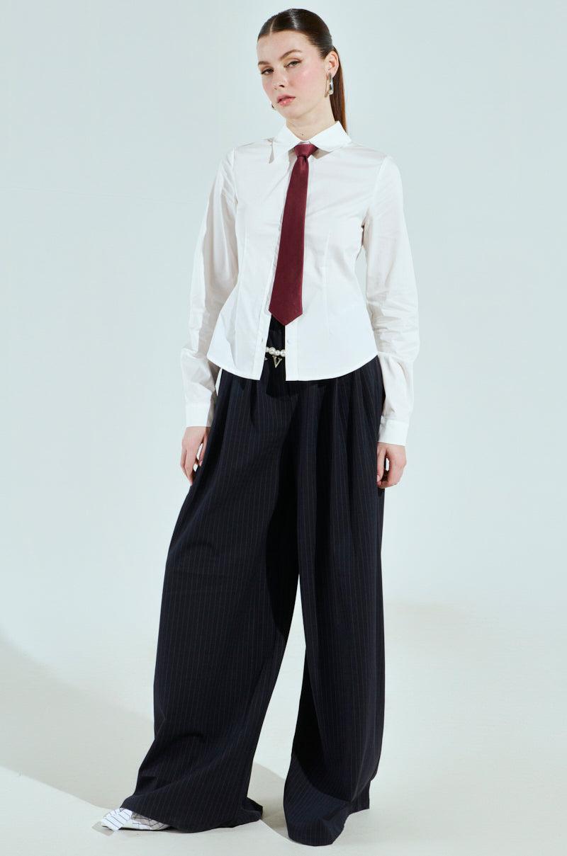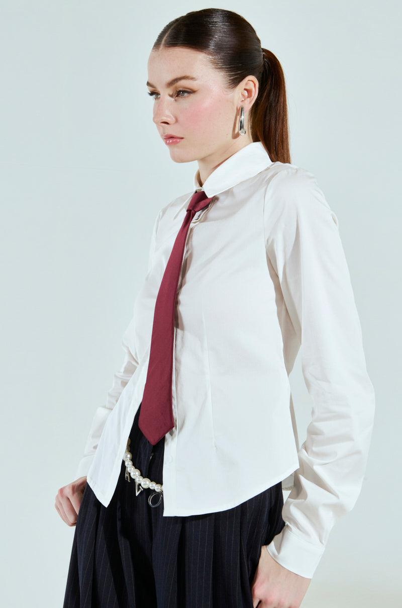 Let ‘em know who’s running the show in The AKIRA Label I’m The Boss Button Down. Crafted from a crisp poplin fabrication, this blouse features a curve-skimming fit, a pointed fold-over collar, a tonal button-down front placket, long sleeves with buttoned cuffs, and a detachable satin necktie. Style with the coordinating I’m The Boss Vest and the I’m The Boss Pant for a suave, sophisticated ensemble. - 65% Cotton, 35% Nylon, 5% Spandex- Slight Stretch- Imported (all measurements approximate from size small) - 23.5” Shoulder to Hem- 14” Shoulder to Shoulder- 26.5” Sleeves- 16.5” Neck Tie Length- Model is 5’9” and wearing a size small Product ID: 472355 (all measurements approximate from size 1X)- 25” Shoulder to Hem- 17” Shoulder to Shoulder- 28” Sleeves- 16.5” Neck Tie LengthProduct ID: 472359
