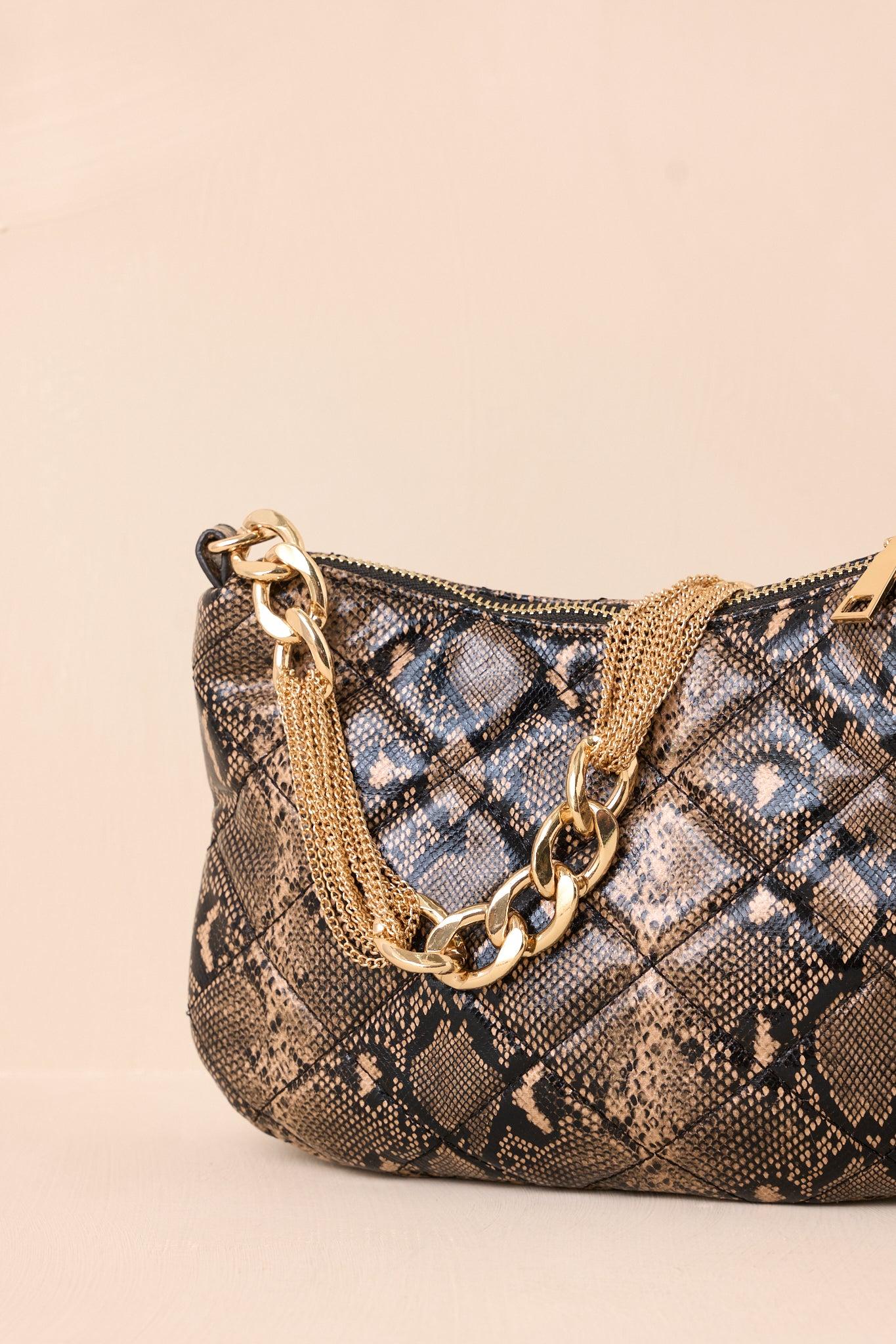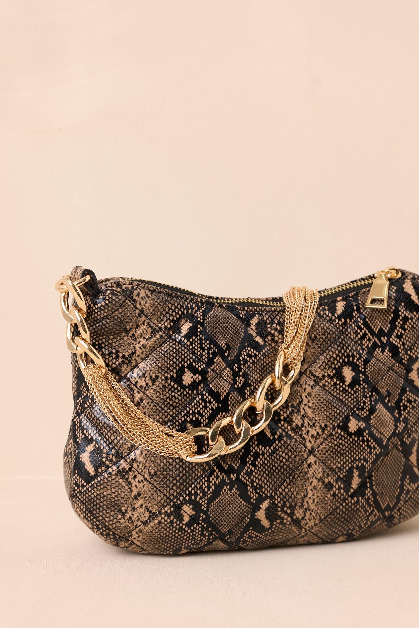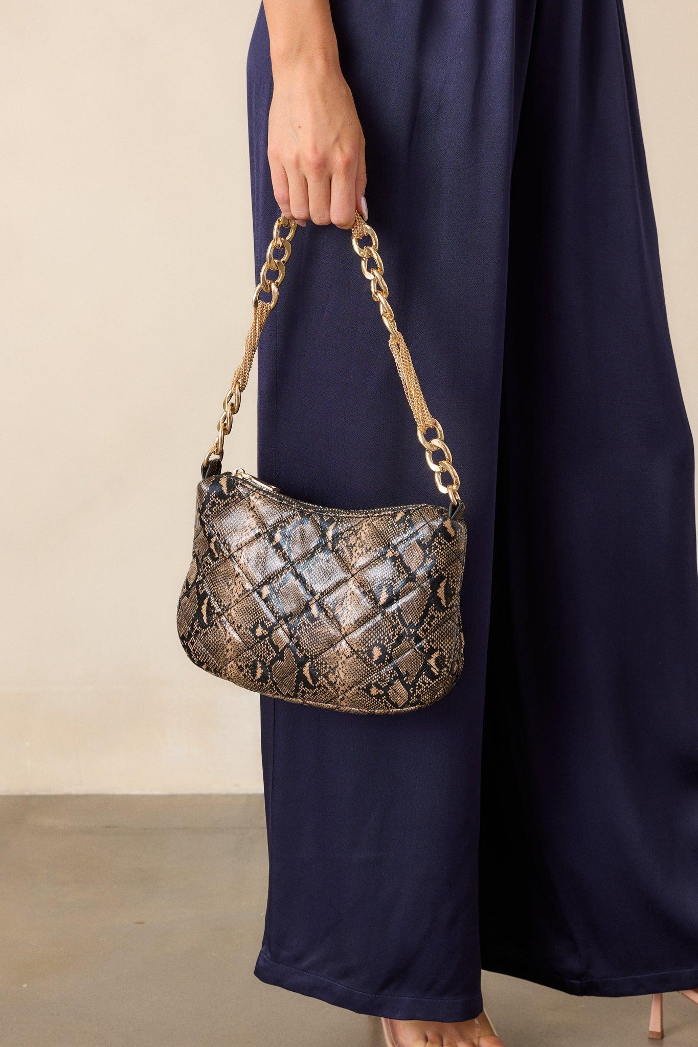 Elevate your outfit with the I'm Yours Tonight Snakeskin Quilted Handbag. Its unique snakeskin design adds a touch of edge to any look. With multiple compartments and a spacious interior, this bag is both stylish and practical. Perfect for a night out or a day at the office, it's the must-have accessory for any fashion-forward individual. This snakeskin bag features a faux leather material, a quilted design, a thick gold chain, a gold zipper closure, an optional thin gold chain shoulder strap and a built-in zipper pocket.