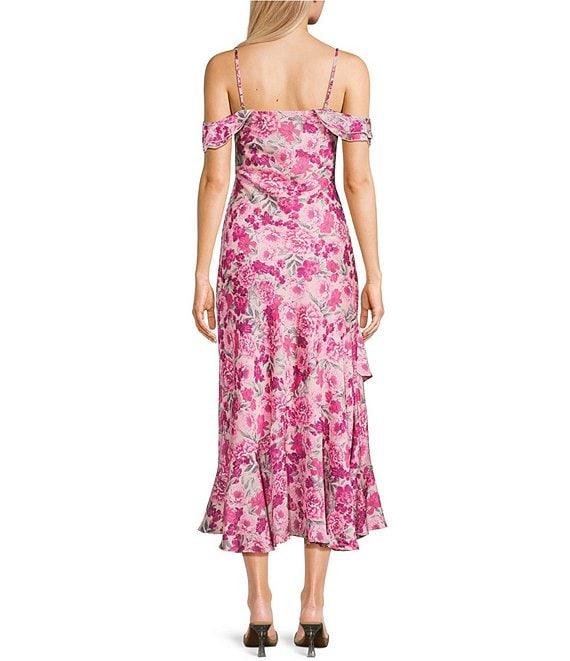From I.N. San Francisco, this dress features:All-over floral printSweetheart off-the-shoulder necklineAdjustable spaghetti strapsFlutter sleevesFull skirt with asymmetrical ruffled hemPullover stylingSelf of polyester/spandex; lining of polyesterMachine wash/line dryImported.