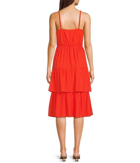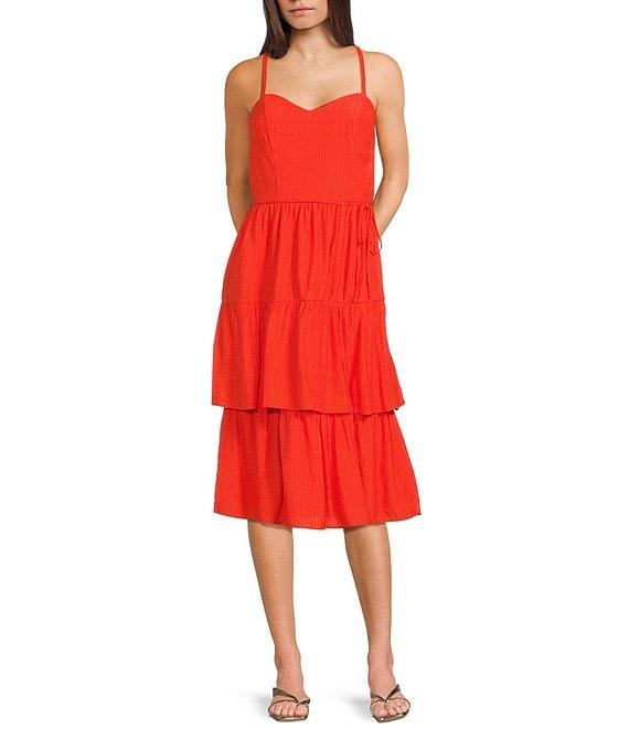 From I.N. San Francisco, this dress features: Textured fabric Sweetheart neckline Sleeveless Adjustable spaghetti straps Front tie detail Long tiered skirt Pullover styling Self of rayon/nylon; lining of polyester Machine wash/line dry Imported.