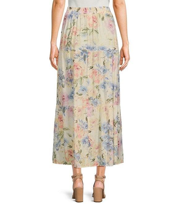 From I.N. San Francisco, this skirt features: Allover floral watercolor print High rise Tiered Side slit Pull-on styling 38" inseam Rayon/nylon Machine wash/line dry Imported.