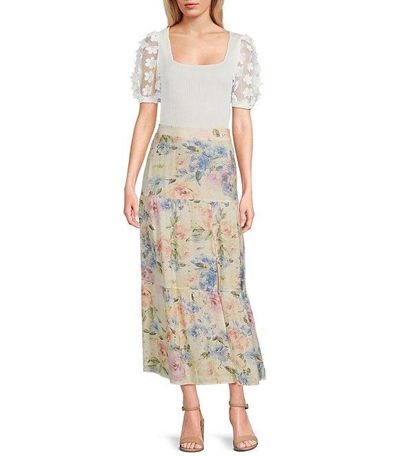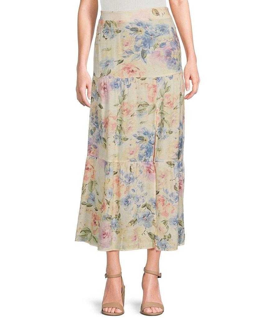 I.N. San Francisco Watercolor Floral Print Tiered Side Slit Maxi Skirt