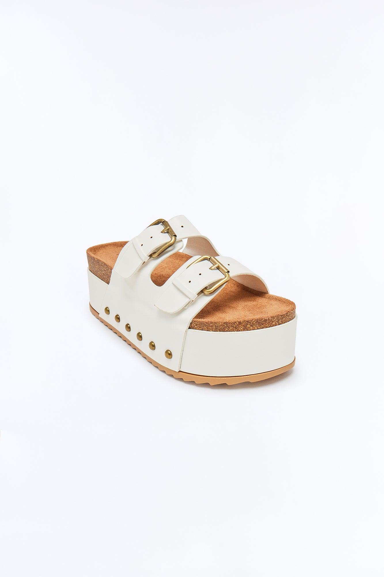 Available In Nude And White. Flatform Sandals Studded Detail Buckle Detail Round Toe 2.5" Flatform Mid Heel Man Made Materials Imported California Proposition 65WARNING: Cancer and Reproductive Harm - www.P65Warnings.ca.gov.
