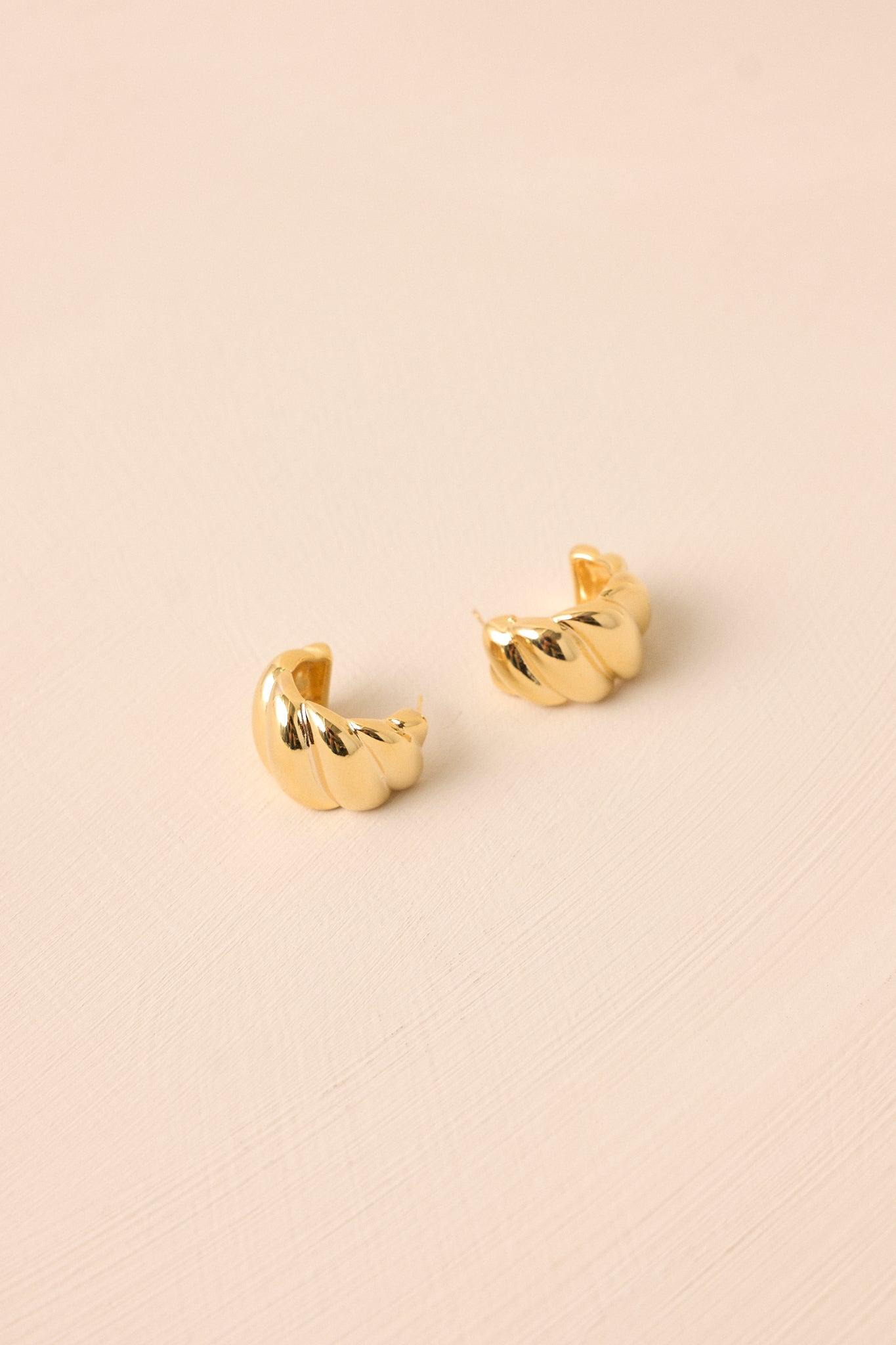 Complete your outfit with our stunning I Will Be Back textured hoop earrings! Made with luxurious gold, these earrings add a touch of glam to any look. Elevate your style and make a statement with these must-have accessories. You'll never want to take them off! These gold earrings feature a twist design, a half hoop structure, and a secure post backing.