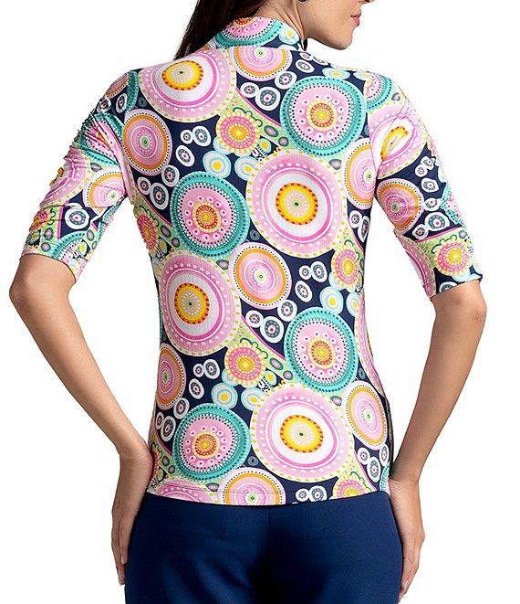 From IBKUL, this top features: Printed 1/4 Zip Mandarin Collar Ruched Elbow Sleeve Pullover construction Shirt tail hem Patented IceFil Cooling Technology which lowers skin temperature up to five degrees by turning your perspiration in refrigerant Moisture Wicking 50 UPF Anti microbial Machine washable Imported.