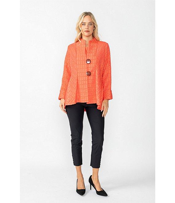 From IC Collection, this jacket features: Crinkle jacquard textured fabrication High neckline Bracelet length sleeves Front & side pockets Flared straight hemline Button front closure Approx. 27.5" back length Polyester Hand wash Made in the USA.