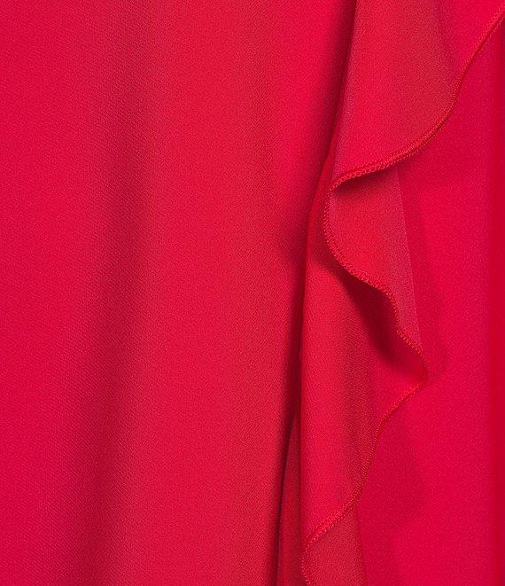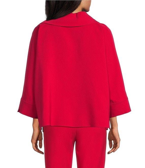From IC Collection, this tunic features: Knit fabrication Funnel fold over neckline 3/4 sleeves Front ruffle detail Straight hem Pullover construction Approx. 23.25" length Polyester/spandex Hand wash Made in the USA.