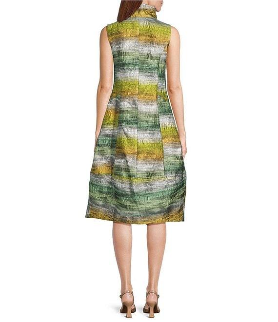From IC Collection, this dress features: Metallic gradien woven fabrication Ruffle stand collar Sleeveless Bubble silhouette Side patch pockets Straight hem Zip front closure Approx. 47" length Polyester Hand wash Made in the USA.