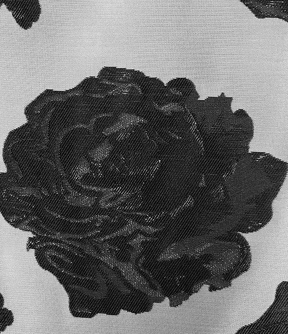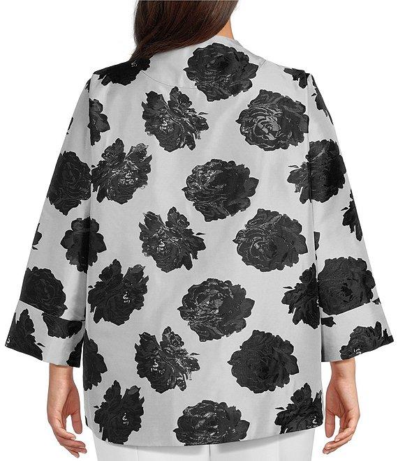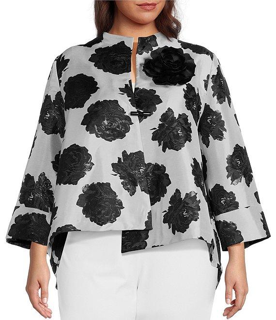 From IC Collection Plus, this jacket features: Jacquard knit fabrication High round collar neckline Bracelet length sleeves Black rose print Rosette at upper side chest Asymmetrical hemline One toggle button front closure Approx. 30.50" in length Polyester/metallic Hand wash Made in the USA.