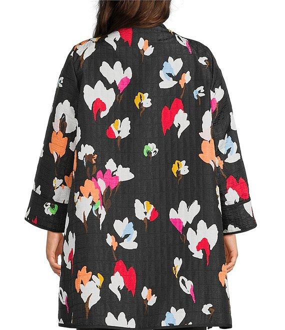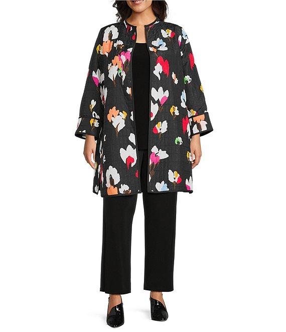 From IC Collection Plus, this jacket features: Woven fabrication Tulip floral print High scoop neckline Long sleeves Side pockets Straight hem Open front closure Approx. 37.5" length Polyester Hand wash Made in the USA.