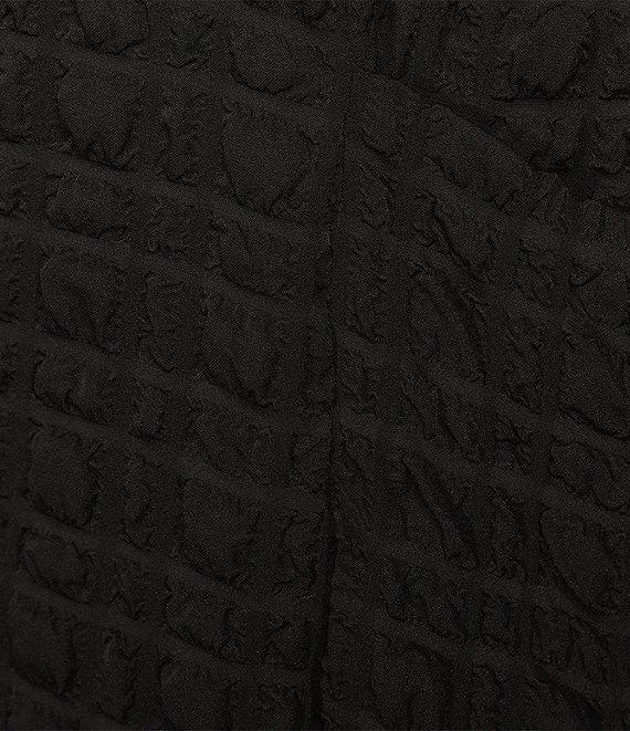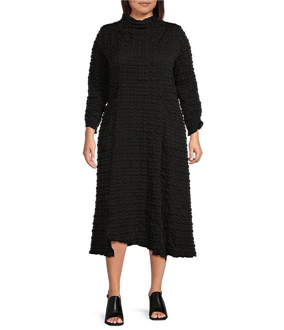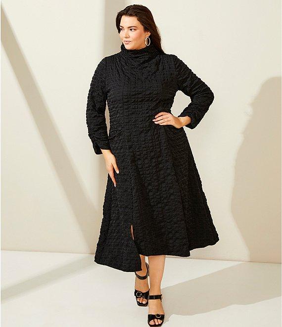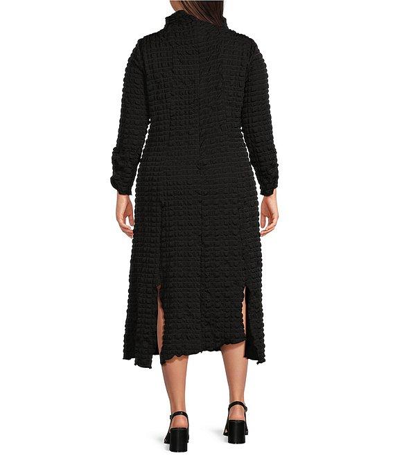 From IC Collection Plus, this dress features: Textured bubble check pucker woven fabrication Sheath silhouette Ruched high mock neckline Bracelet length sleeves Side front pockets Asymmetrical hemline with slit Back zipper closure Approx. 49.5" in length Polyester/elastane Hand wash Made in the US of imported fabric