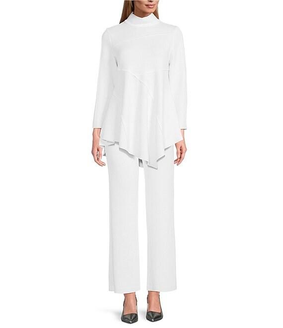 From IC Collection, this top features: Soft knit crepe fabrication Mock neckline Long sleeves Front seam details Asymmetrical hemline Pullover construction Concealed back zipper closure Approx. 32.5" length Rayon/polyester/spandex Hand wash Made in the USA.