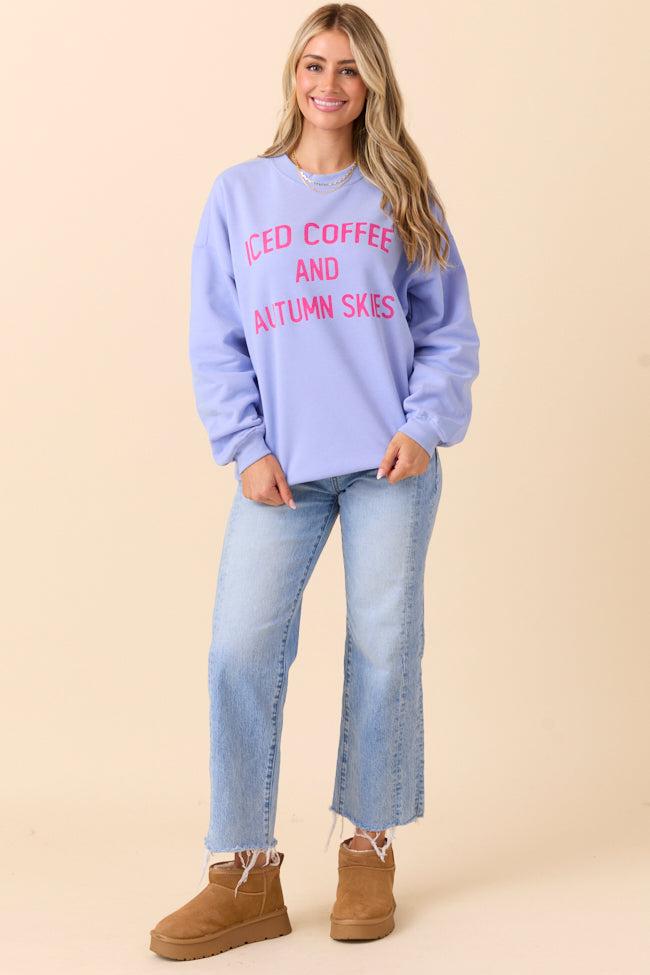 Details Periwinkle crewneck with iced coffee drink and fall design Crew neckline Long sleeves Material and Care Pink Lily Exclusive Sweatshirt 57% Cotton/43% Polyester For best results, wash inside out on a gentle cycle with cold or lukewarm water. Tumble dry low or hang to dry to keep your tee looking fab! Size and Fit Relaxed fit Length: 26"