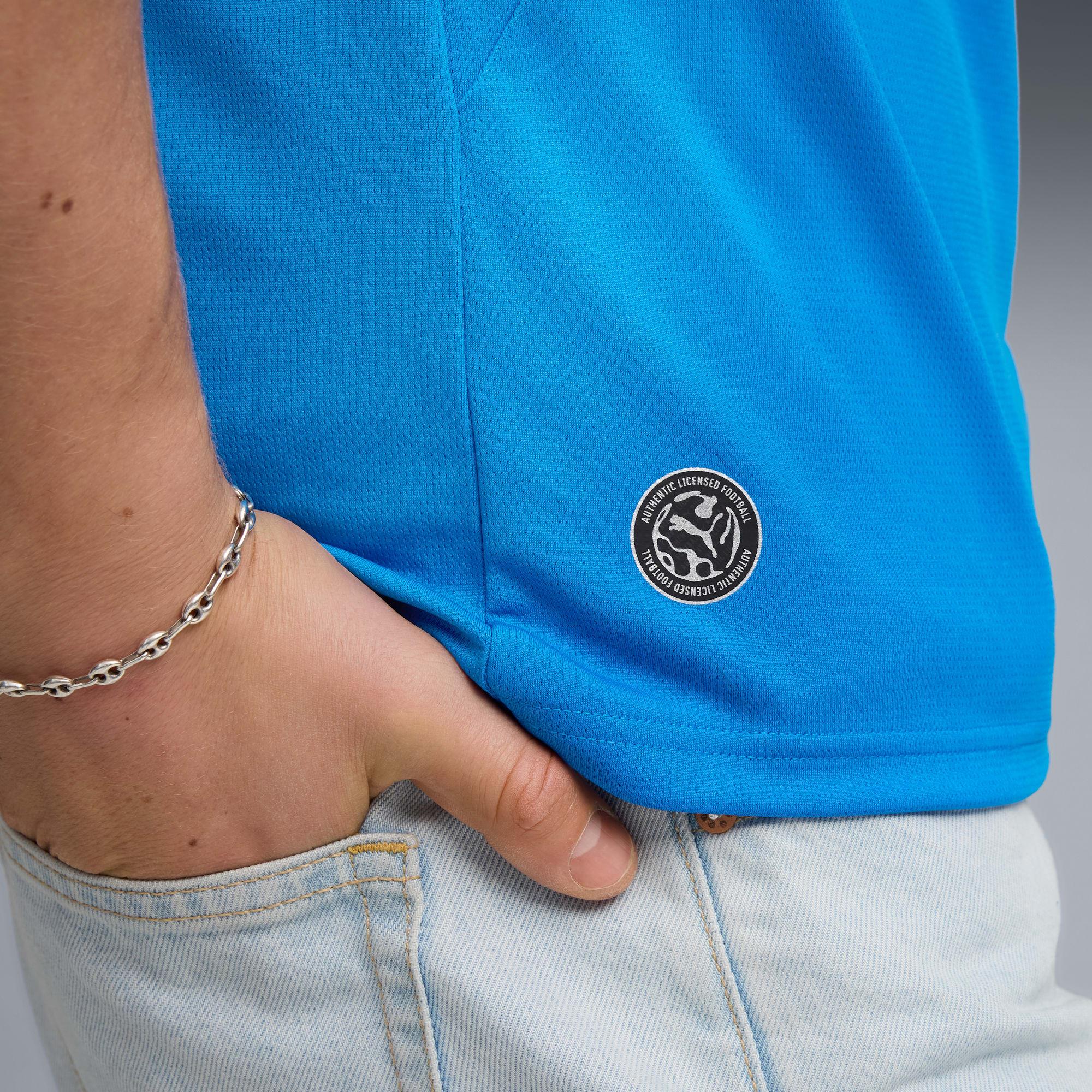 Icelandâs Home Kit channels the nationâs volcanic landscapes and icy resilience. Itâs a kit forged from contrasts, with a design inspired by glaciers and the fire of a nation ready to erupt on the world stage once again. FEATURES & BENEFITS MOISTURE MANAGEMENT: Technical dryCELL fabrics wick moisture away from the skin to help keep you dry and comfortableAs part of the RE:FIBRE program, this garment is made of at least 95% recycled material from textile waste and other used materials. Fit: RegularMain material Double-face jacquardNeck: Ribbed crew neckShort sleevesTeam and PUMA branding detailsMesh panels for ventilation | PUMA Iceland Home Men's Soccer Jersey in Blue, Size XL