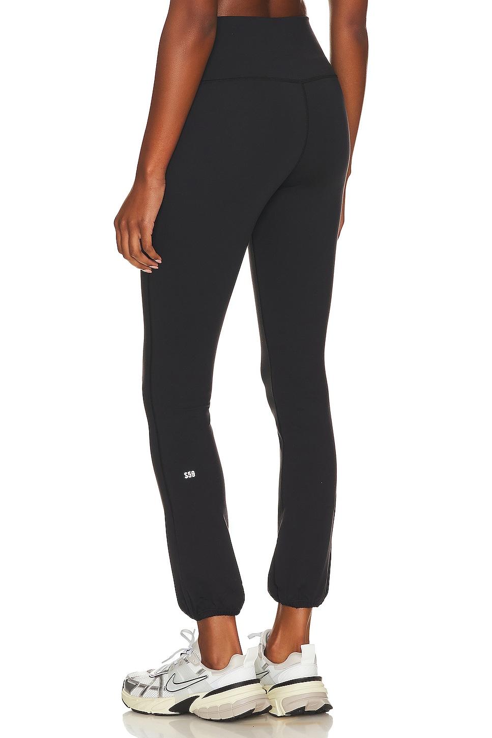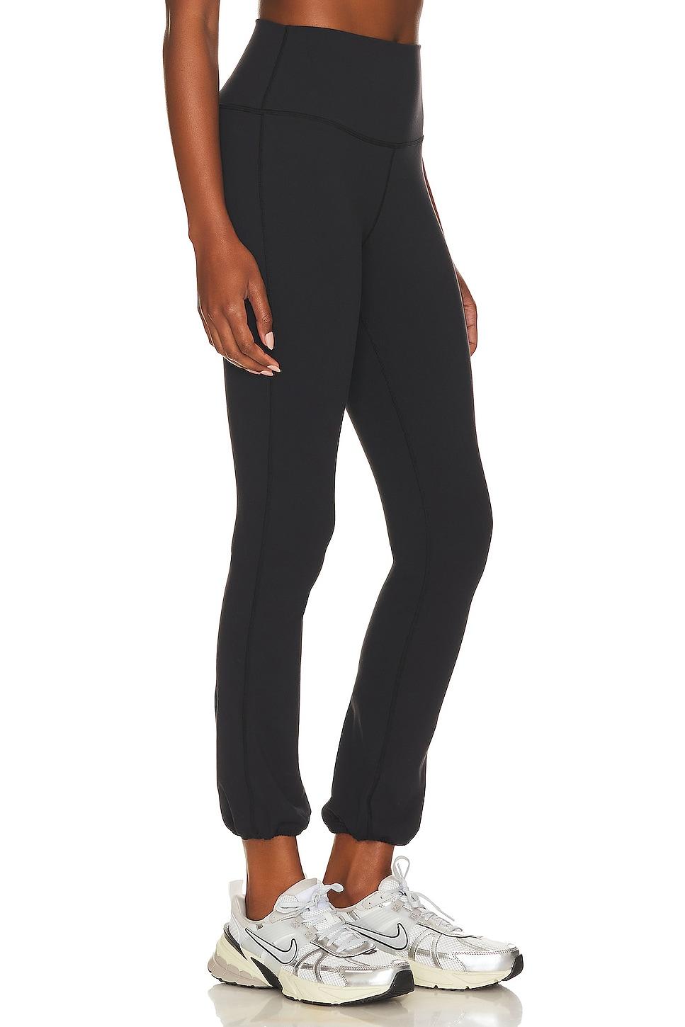 87% nylon, 13% spandex. Made in China. Machine wash. Wide waistband. Elastic cuffs. Reflective logo detail. Subtle compressive fabric. 12" at the knee narrows to 10" at the leg opening. Revolve Style No. SPLR-WP140. Manufacturer Style No. E1110_BLACK.