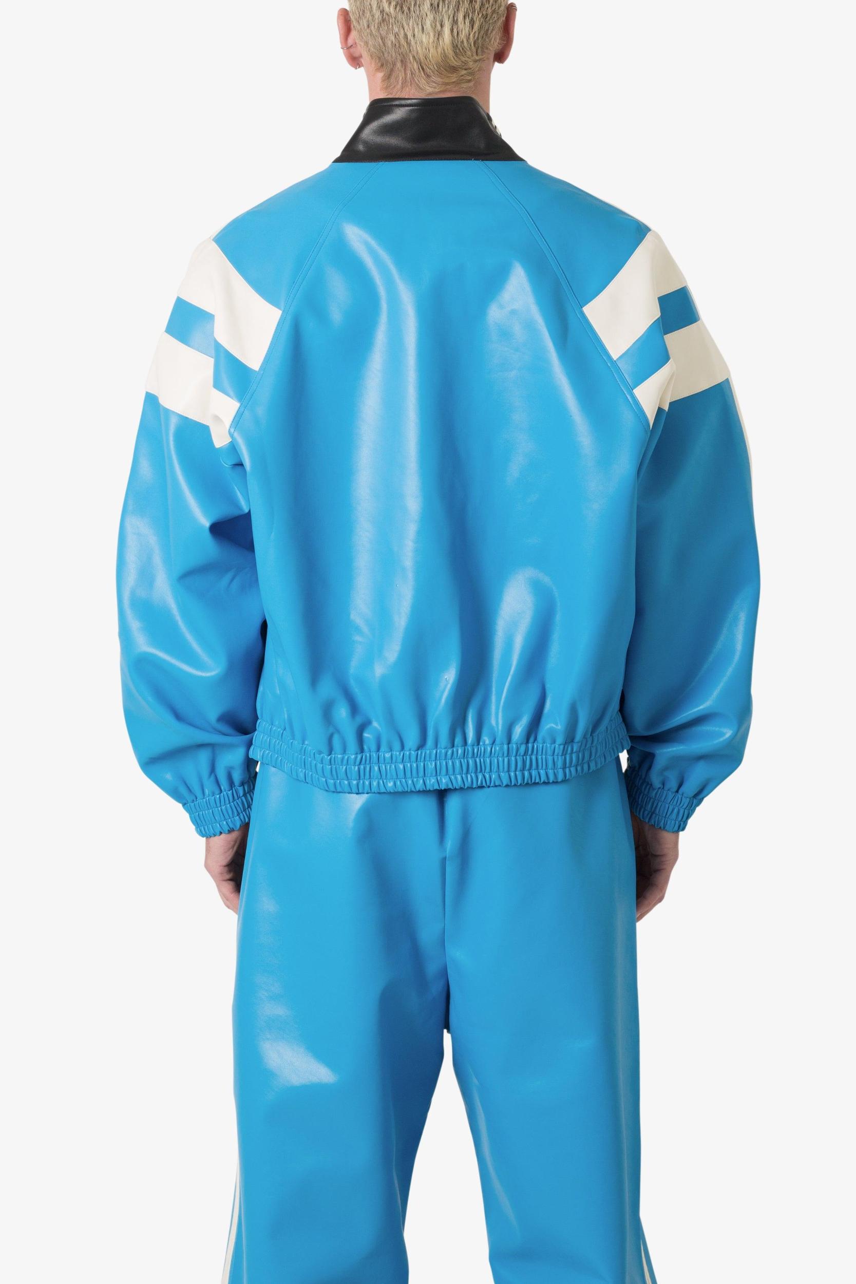 the Icon Oversized PU Track Jacket is constructed from a vegan leather fabric, contrast panelling details throughout, self ribbing at the wrists and waist, extended collar height, and finished with a zipper placket. details baggy fit 100% polyester model is 6’1, 160 lbs and wears a size medium