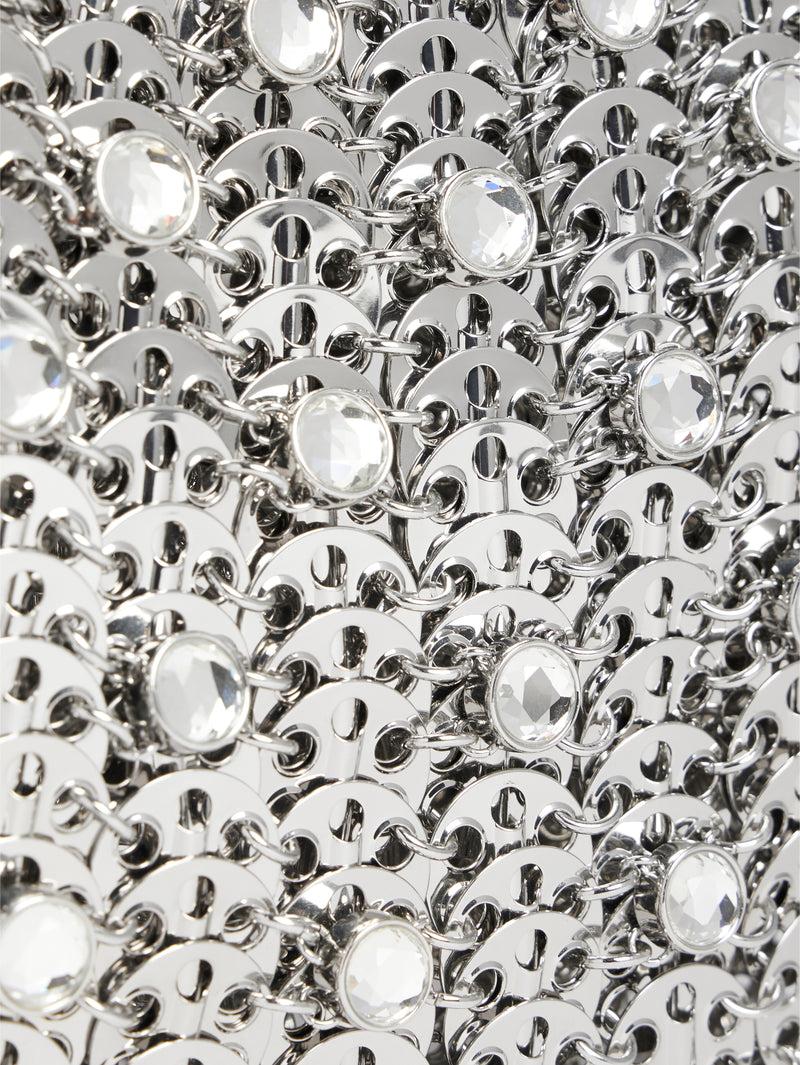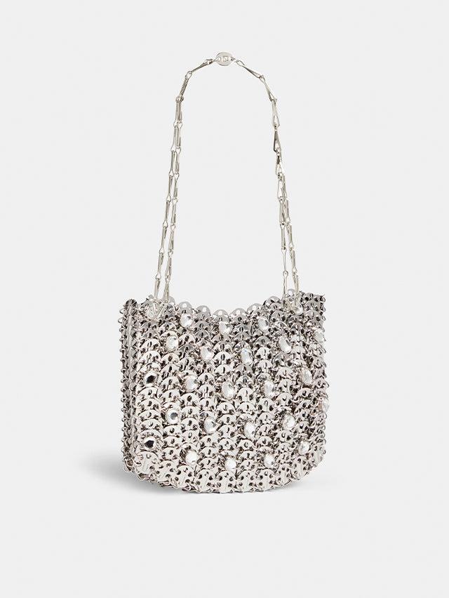 Relaunch of the Iconic 1969 bag with rhinestones. This radiant silver bag adorned with glass rhinestones is a true reflection of the identity and expertise of the Maison Rabanne. The pliable silver bag is a unique fabrication of 367 silver discs bonded by metal rings.
