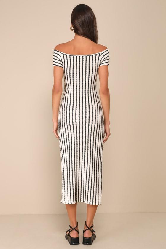 When we feel like looking flirty and effortlessly stylish, we immediately reach for a strappy pair of sandals and the Lulus Iconic Always Black and White Striped Textured Midi Dress! Stretchy, textured knit boasts a classic black and white striped pattern throughout as it shapes a darted, crisscrossing bodice that flows into wide, off-the-shoulder sleeves. The flirty bodycon silhouette will perfectly snatch your figure as it falls a chic midi hem.