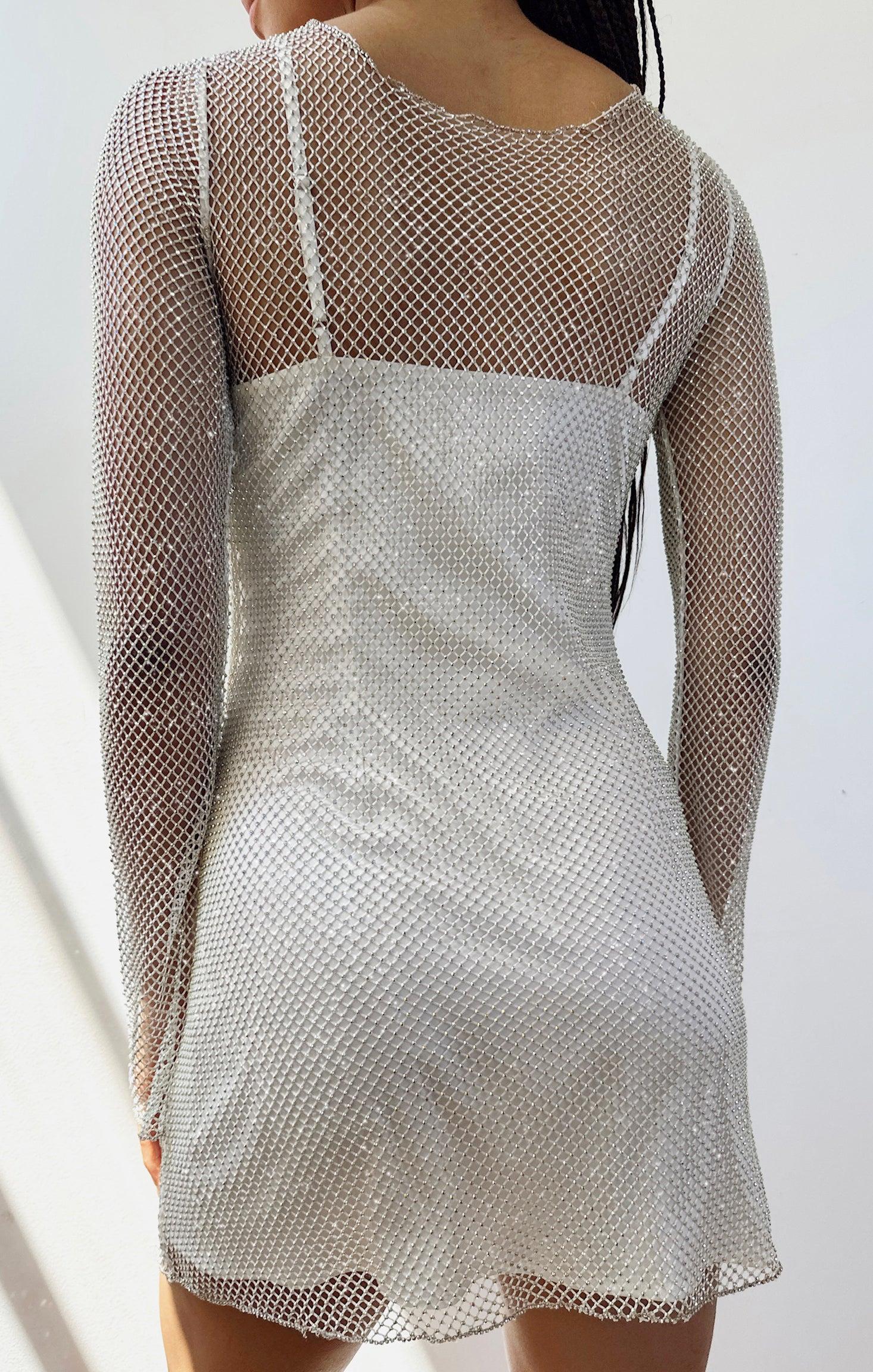 Make your presence known in this Iconic micro mini! A minimalist long sleeve silhouette is instantly elevated with sparkling mesh details. Perfectly paired with a bold lip and matching accessories. FIT TIP: Detachable slip with just a quick snip!