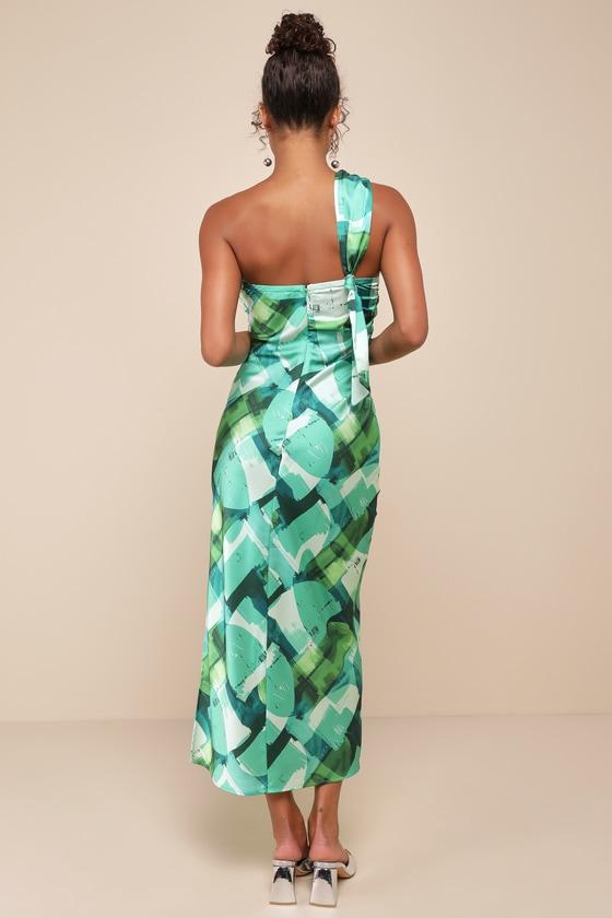 Catch everyone's attention with a memorable look like the Lulus Iconic Presence Green Abstract Satin One-Shoulder Midi Dress! Sleek woven satin, with a green abstract print throughout, shapes a single, sash strap that crosses the one-shoulder neckline and secures atop the open-back design with a knotted detail at the side. Fitted bodice features an asymmetrical, overlay with gathering at the sides. The figure-skimming silhouette continues into a slip-style skirt that finishes at a midi hem with a flirty side slit. Hidden back zipper/clasp.