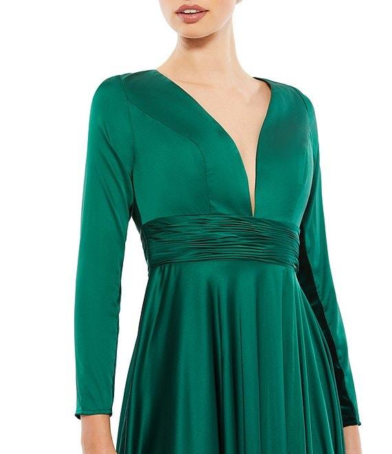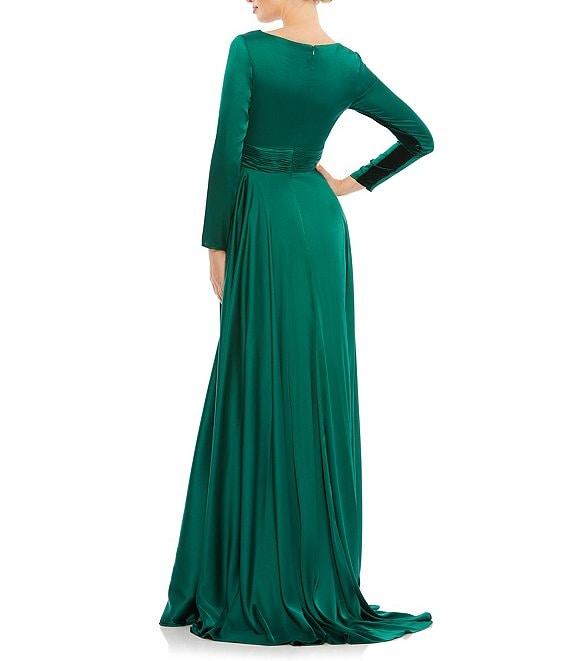 From Ieena for Mac Duggal, this gown features: satin fabrication v-neckline 3/4 sleeves fully lined high slit center back zipper approx. 62.5" length from shoulder to hem polyester spot clean Imported.