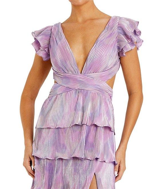 Ieena for Mac Duggal Deep V-Neck Ruffle Shoulder Cap Sleeve Side Cut-Out Tiered Thigh High Slit Gown