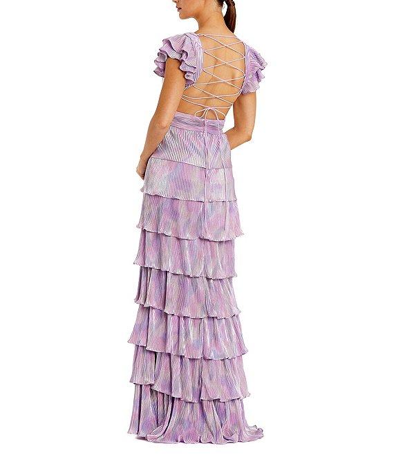 From Ieena for Mac Duggal, this gown features: deep v-necklinecap sleevesside cut outtiered flutter skirt lace backfully linedcenter back zipper closure approx. 62.5" length from shoulder to hem polyesterspot cleanImported.