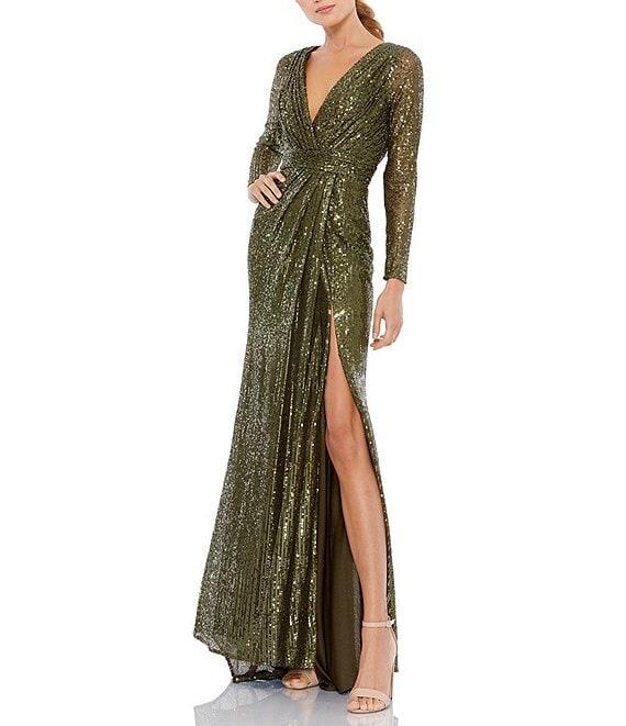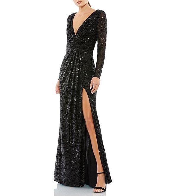 From Ieena for Mac Duggal, this gown features: sequin fabrication surplice v-neckline long sleeves high slit fully lined center back zipper closure approx. 62.5" length from shoulder to hemline polyester spot clean Imported.